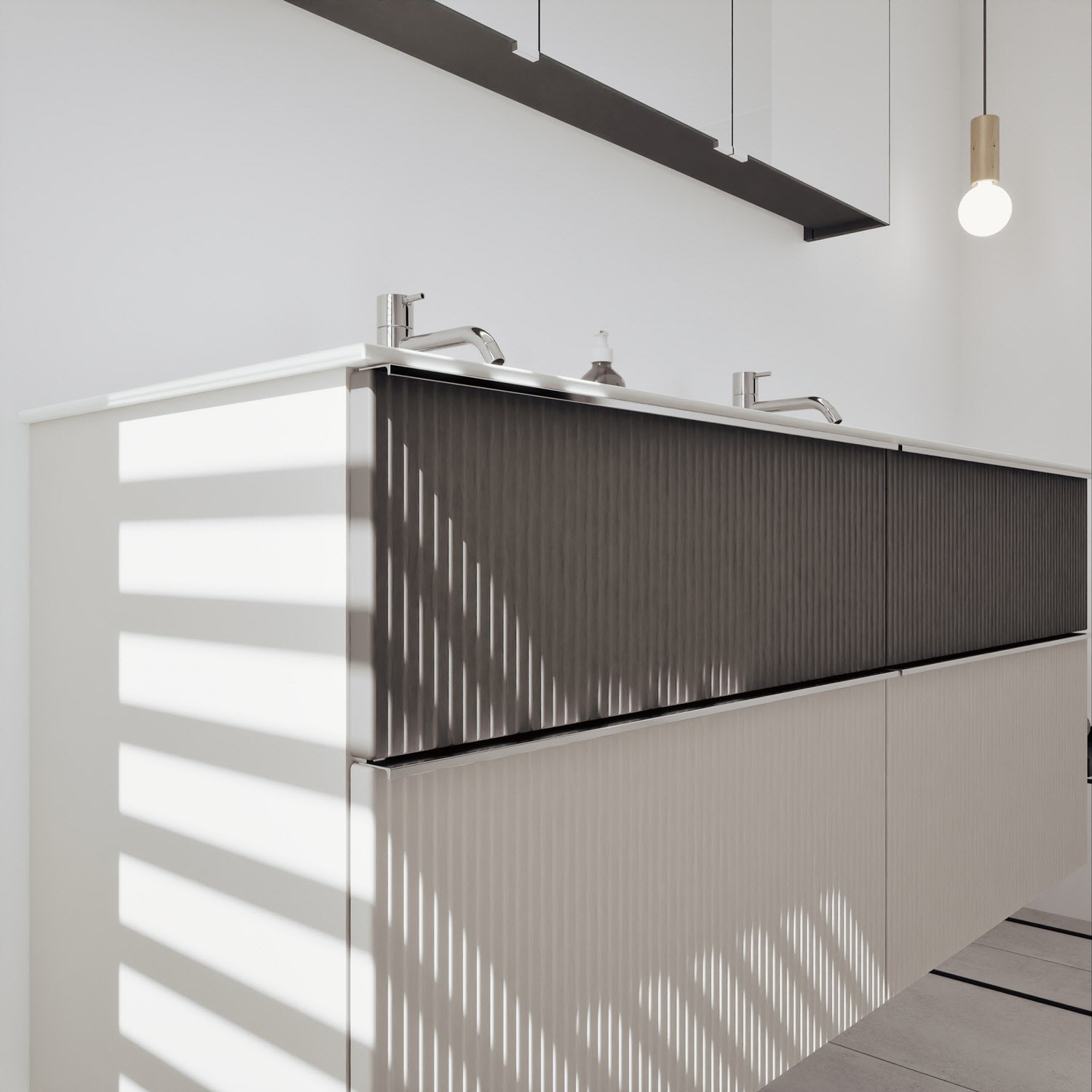 - 2 Schubladen oben, 35 cm tief, mit vertikaler Struktur inkl. mit Siphonausschnitt und Inneneinteilung
