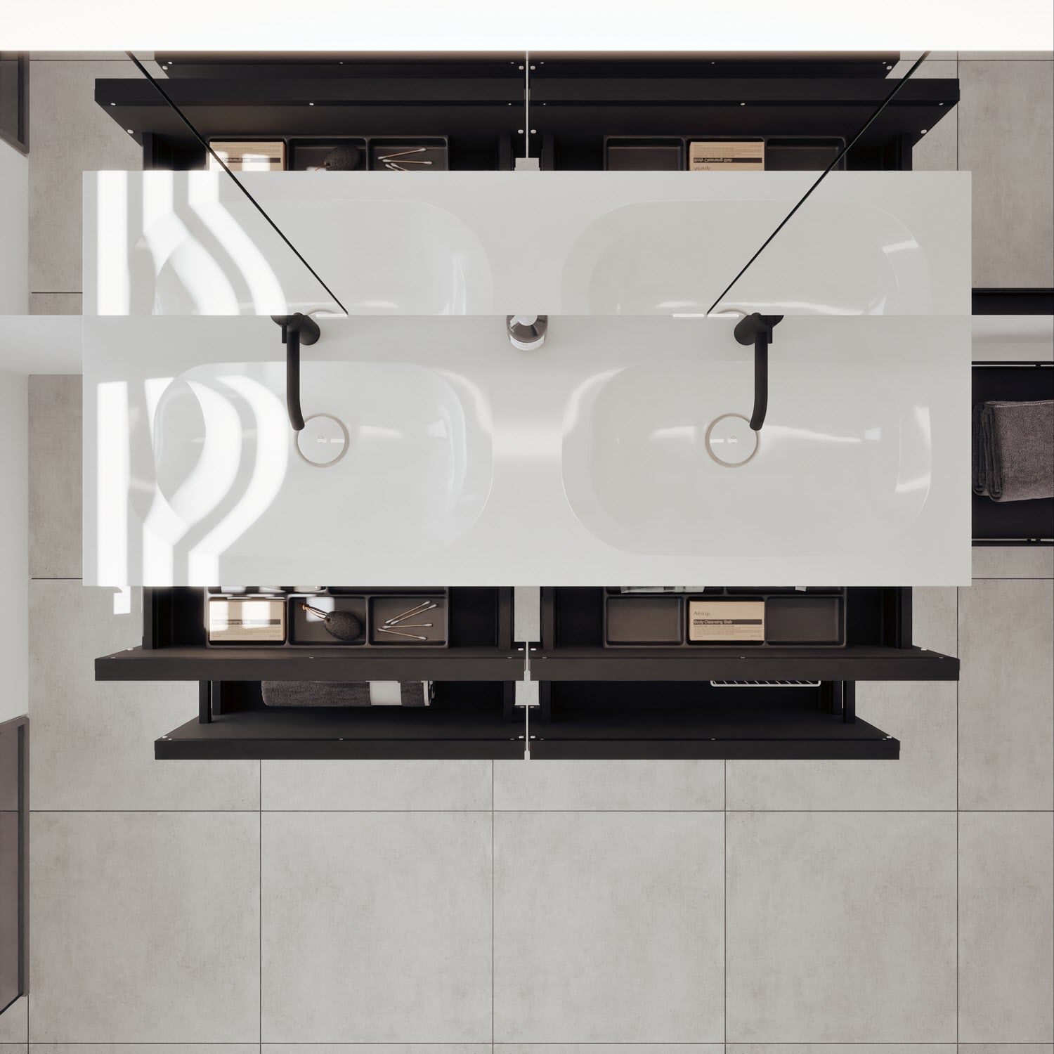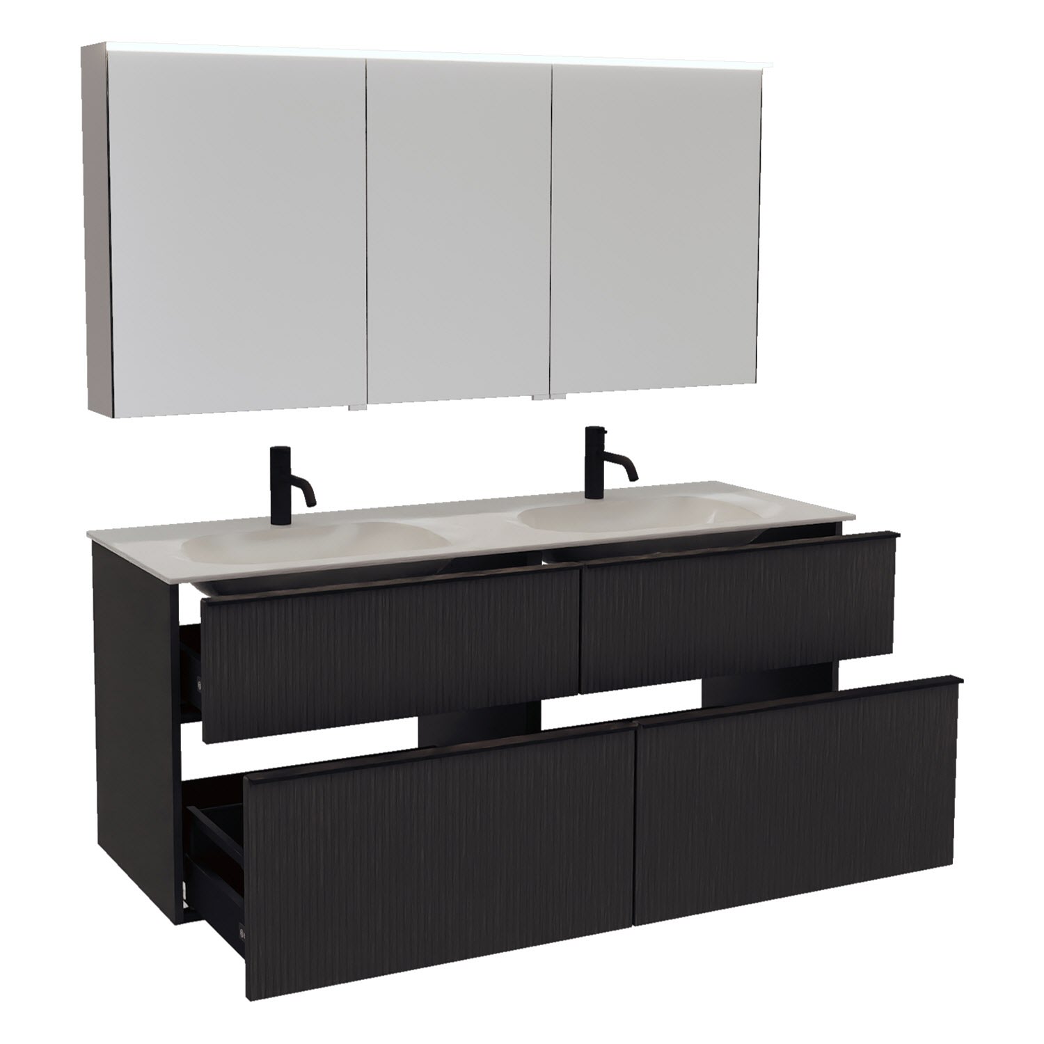 - 2 Schubladen oben, 35 cm tief, mit vertikaler Struktur inkl. mit Siphonausschnitt und Inneneinteilung