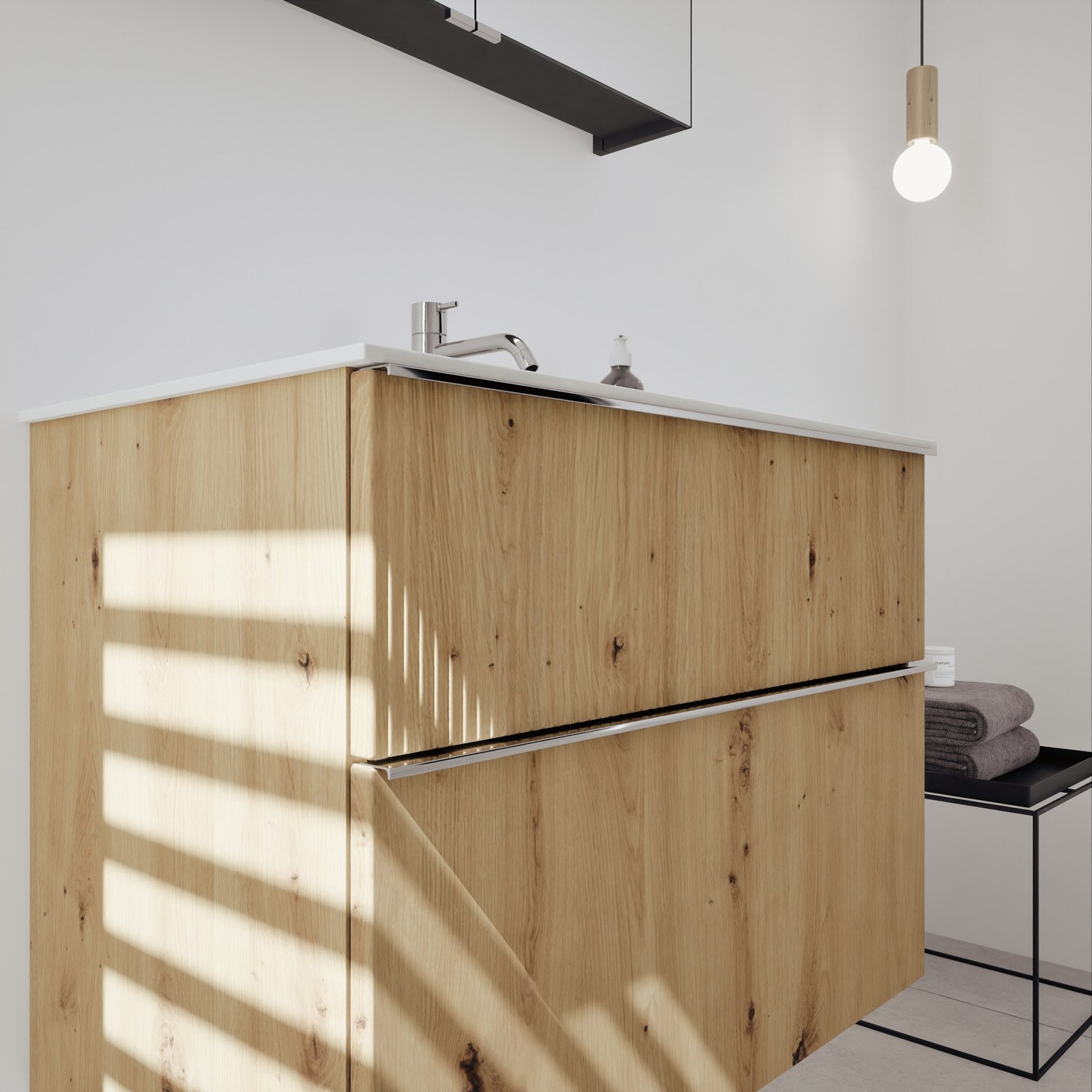 - 1 Schublade oben 35 cm tief, mit vertikaler Struktur inkl. Siphonausschnitt und Inneneinteilung