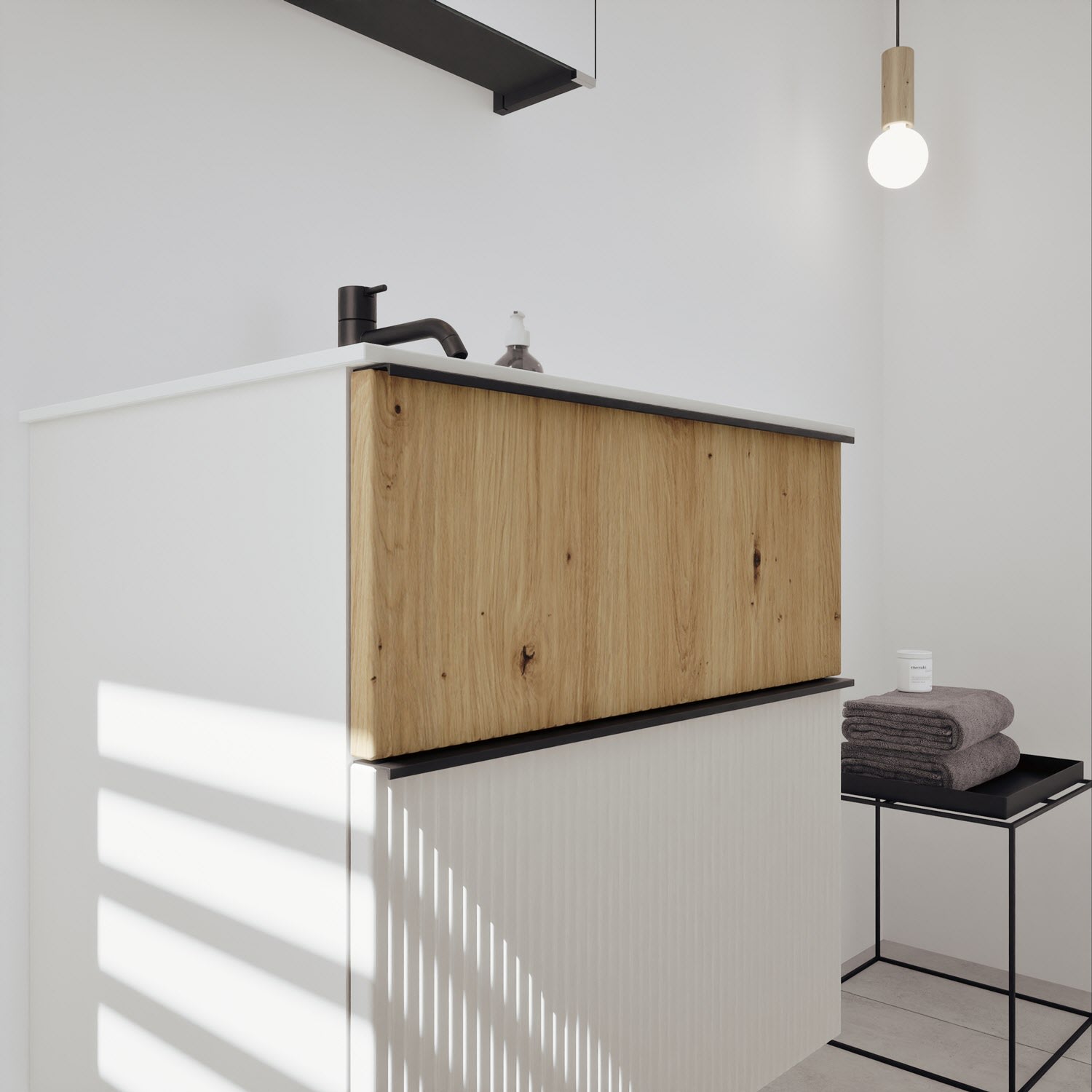 - 1 Schublade oben, 35 cm tief, mit vertikaler Struktur inkl. Siphonausschnitt und Inneneinteilung