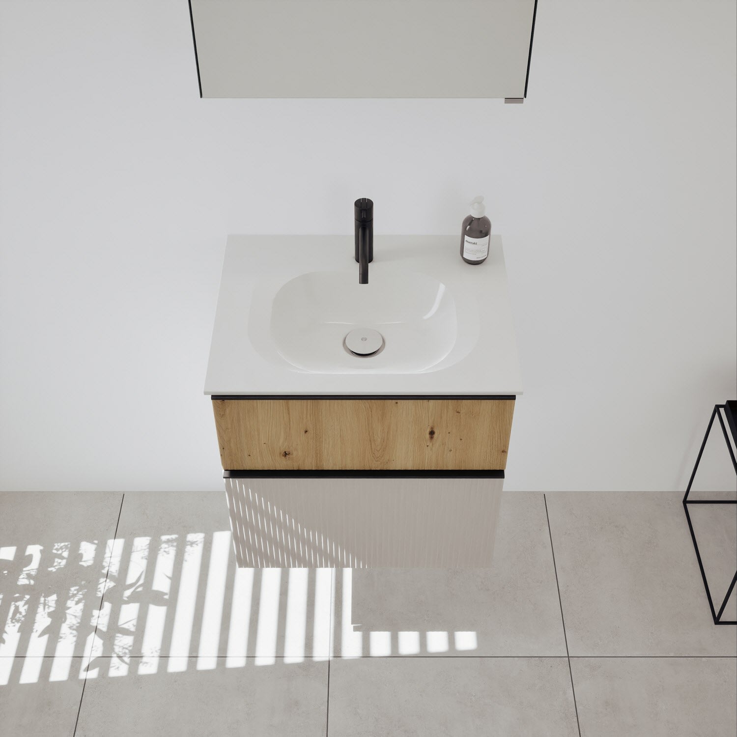 - 1 Schublade oben, 35 cm tief, mit vertikaler Struktur inkl. Siphonausschnitt und Inneneinteilung