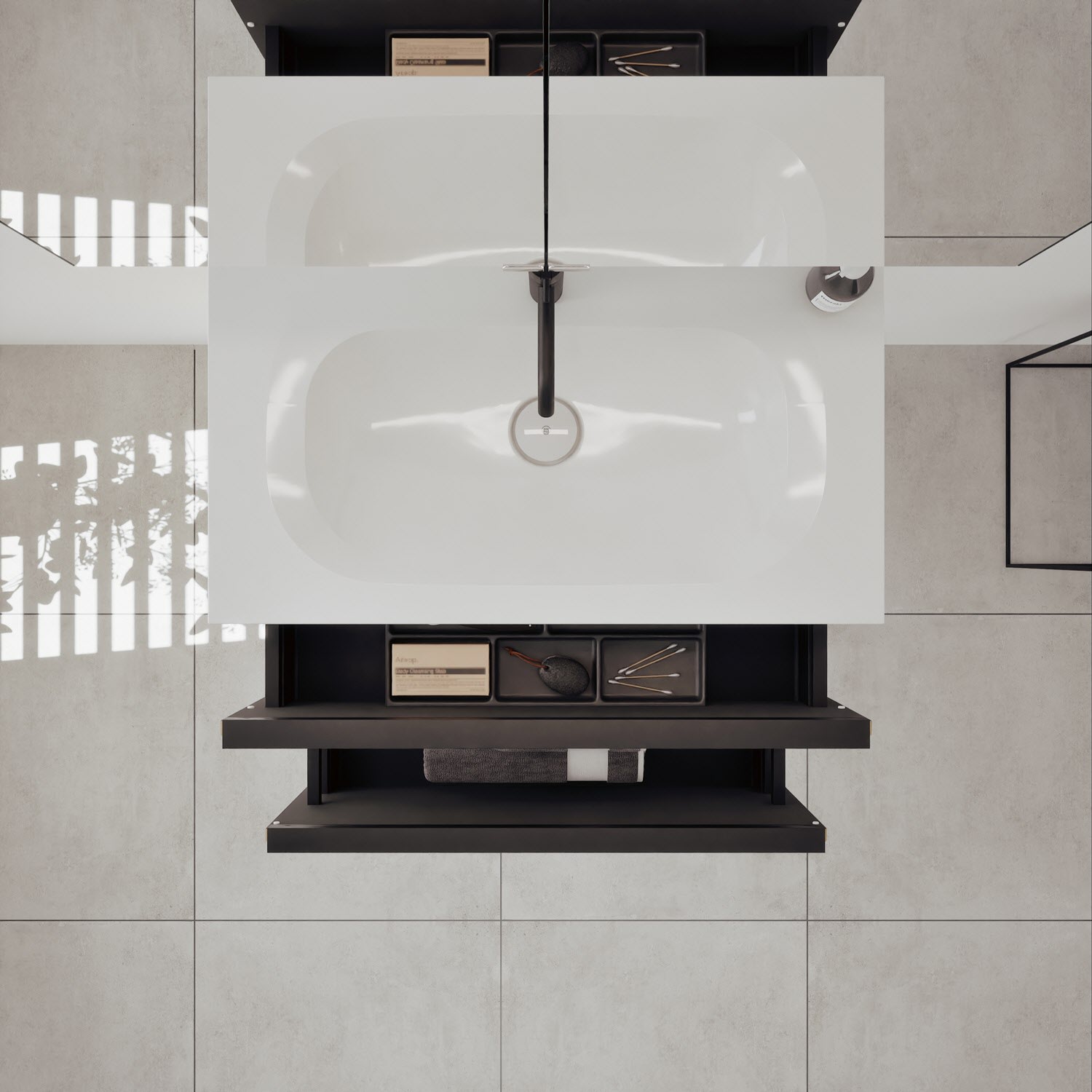- 1 Schublade oben, 35 cm tief, mit vertikaler Struktur inkl. Siphonausschnitt und Inneneinteilung