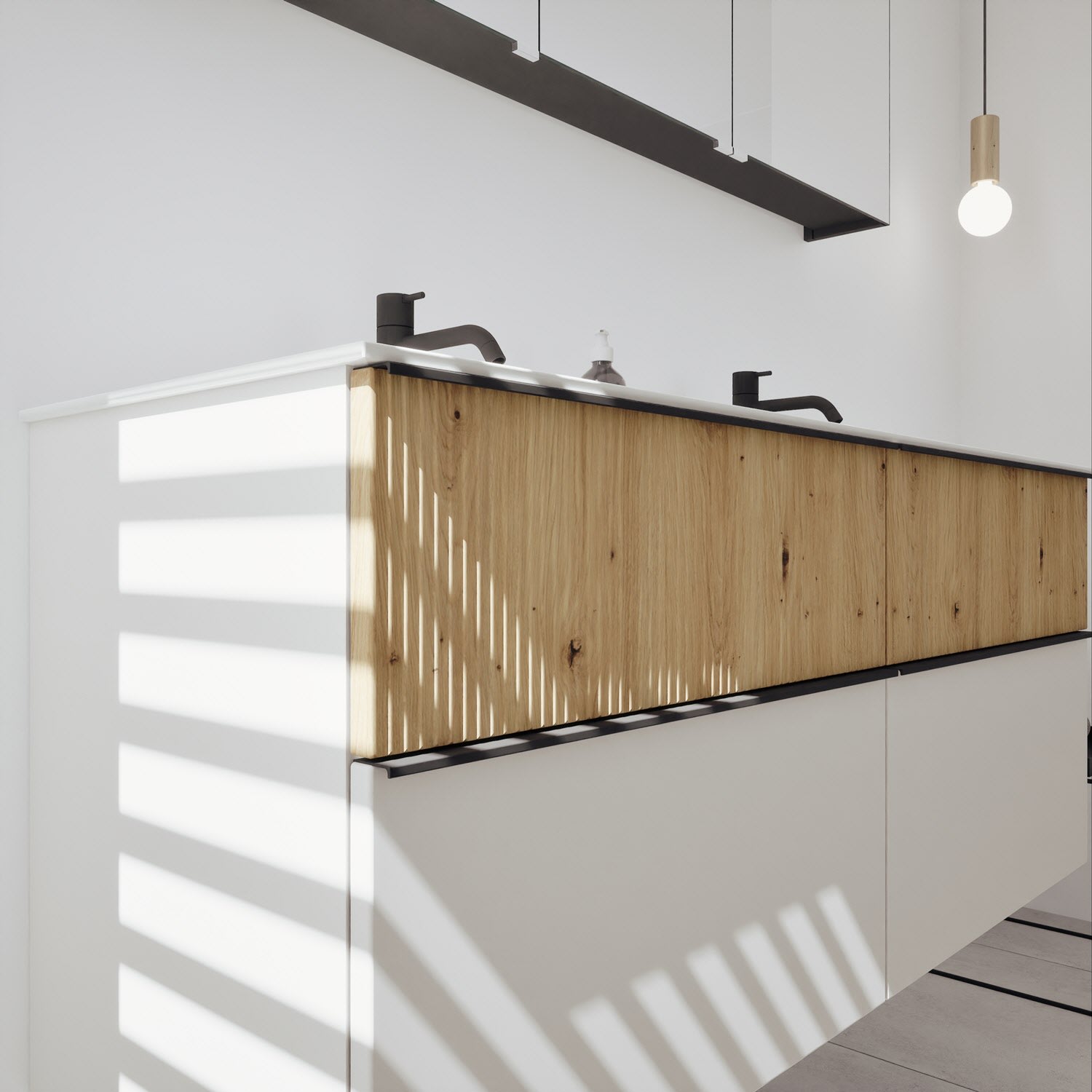 - 2 Schubladen oben, 35 cm tief, mit vertikaler Struktur inkl. mit Siphonausschnitt und Inneneinteilung