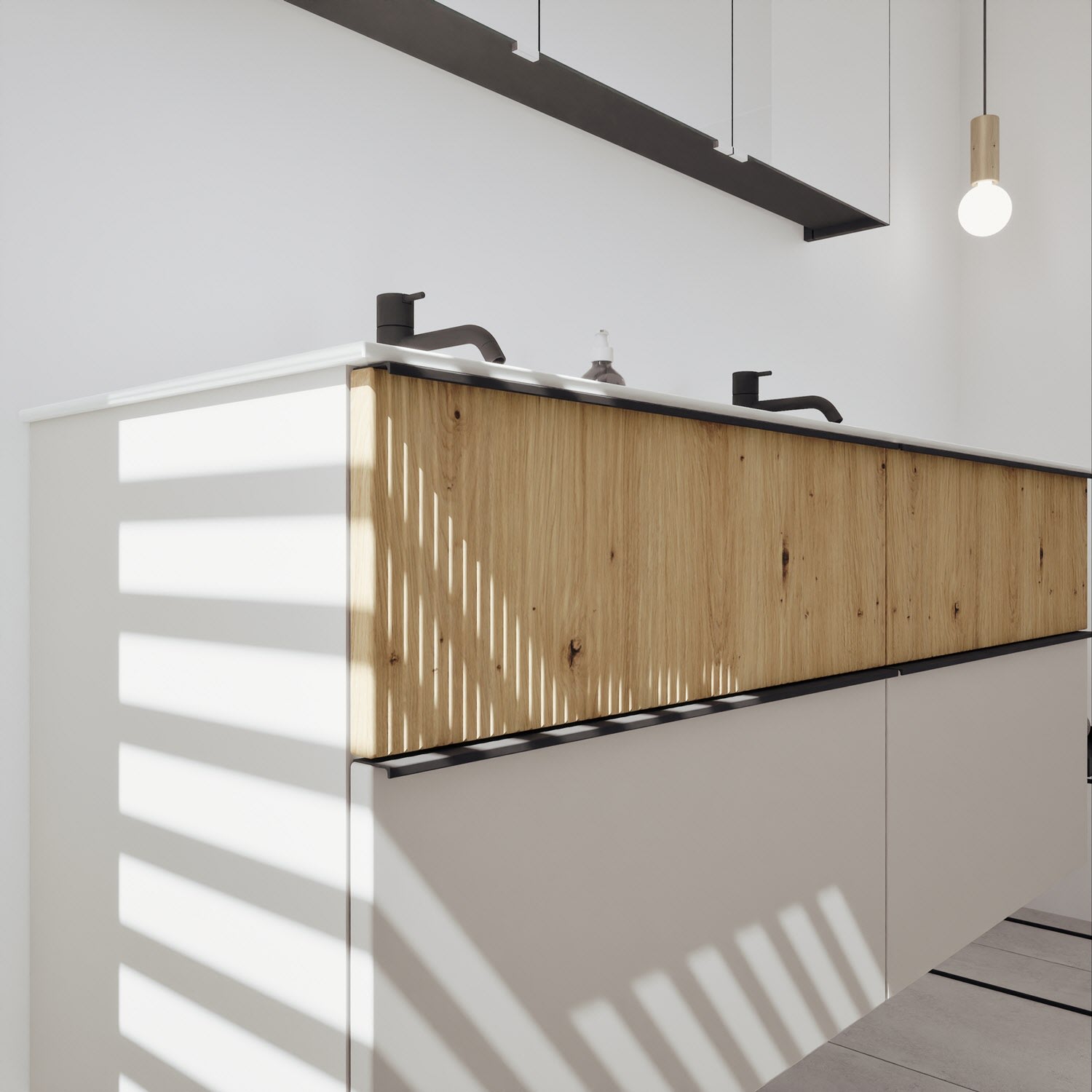 - 2 Schubladen oben, 35 cm tief, mit vertikaler Struktur inkl. mit Siphonausschnitt und Inneneinteilung
