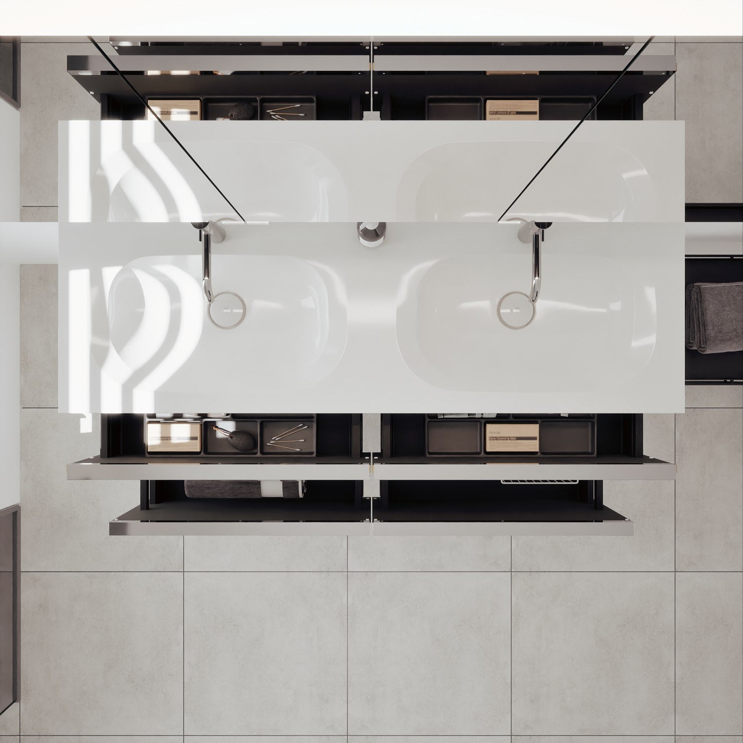 - 2 Schubladen oben, 35 cm tief, mit vertikaler Struktur inkl. mit Siphonausschnitt und Inneneinteilung