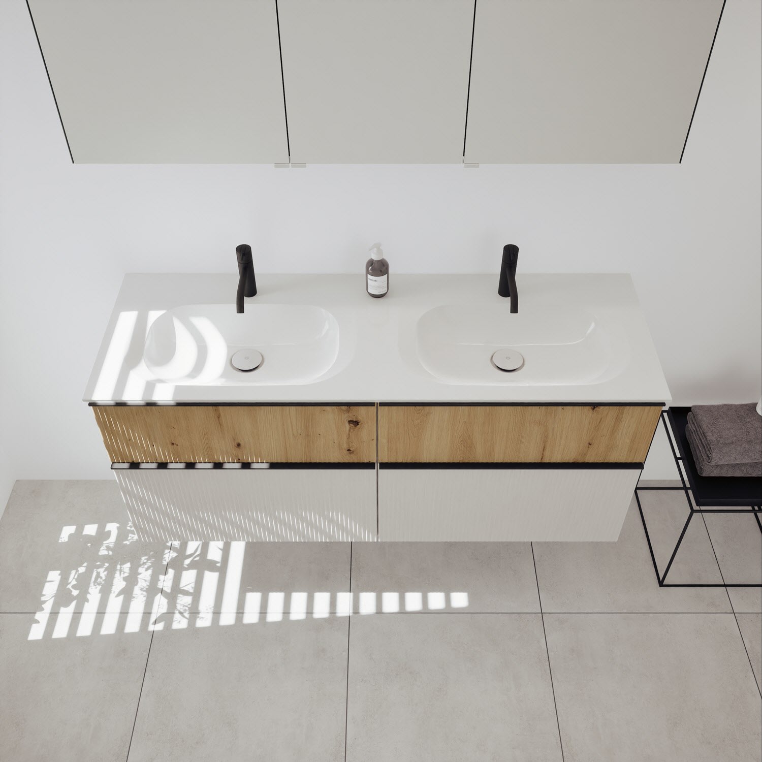 - 2 Schubladen oben, 35 cm tief, mit vertikaler Struktur inkl. mit Siphonausschnitt und Inneneinteilung