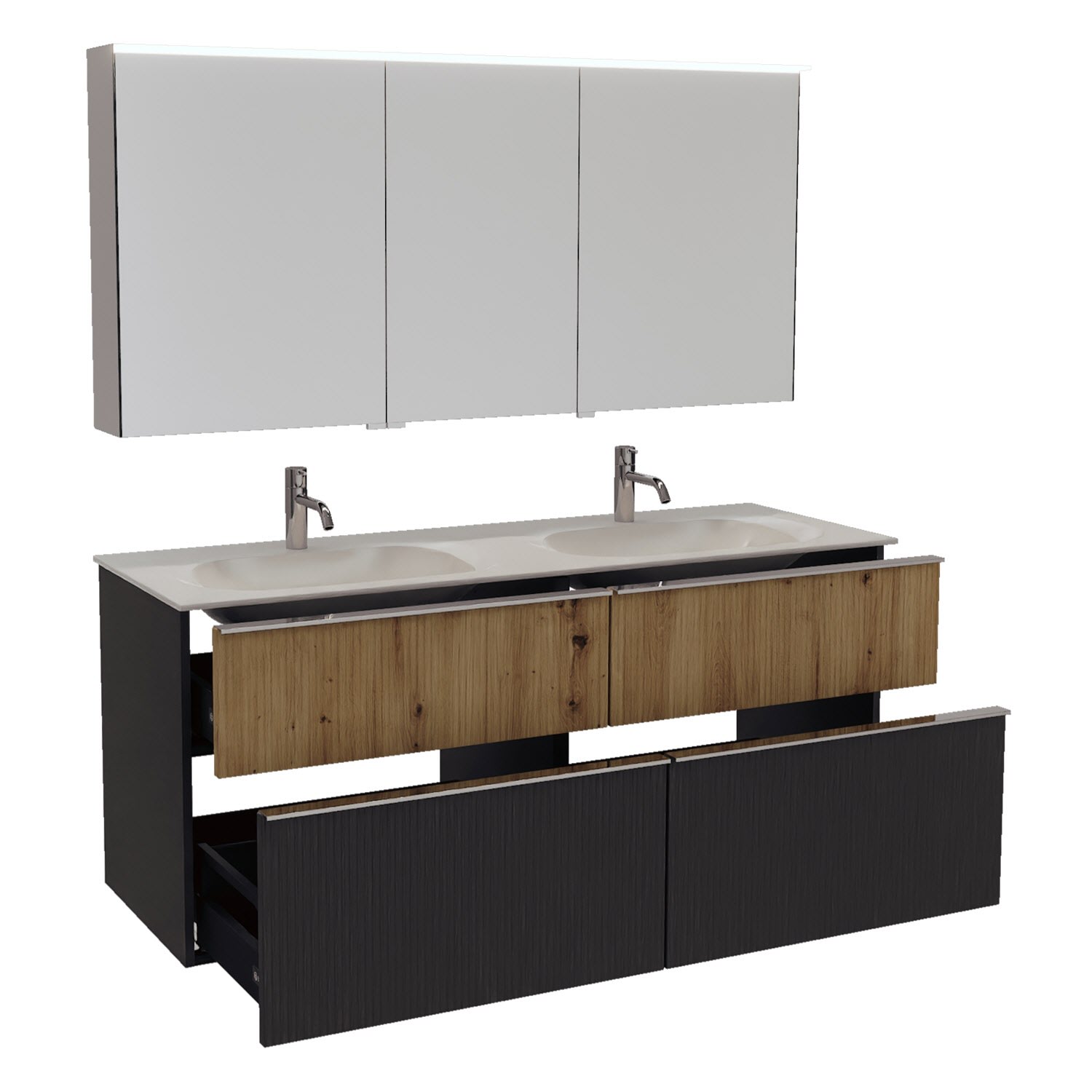 - 2 Schubladen oben, 35 cm tief, mit vertikaler Struktur inkl. mit Siphonausschnitt und Inneneinteilung