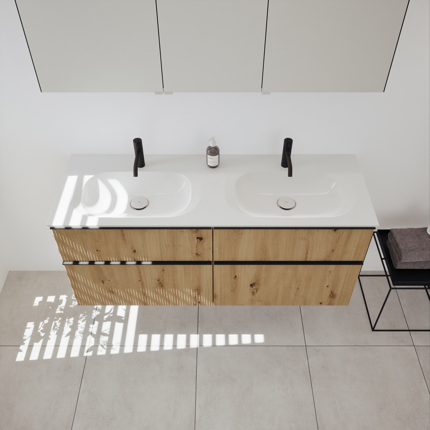 - 2 Schubladen oben, 35 cm tief, mit vertikaler Struktur inkl. mit Siphonausschnitt und Inneneinteilung