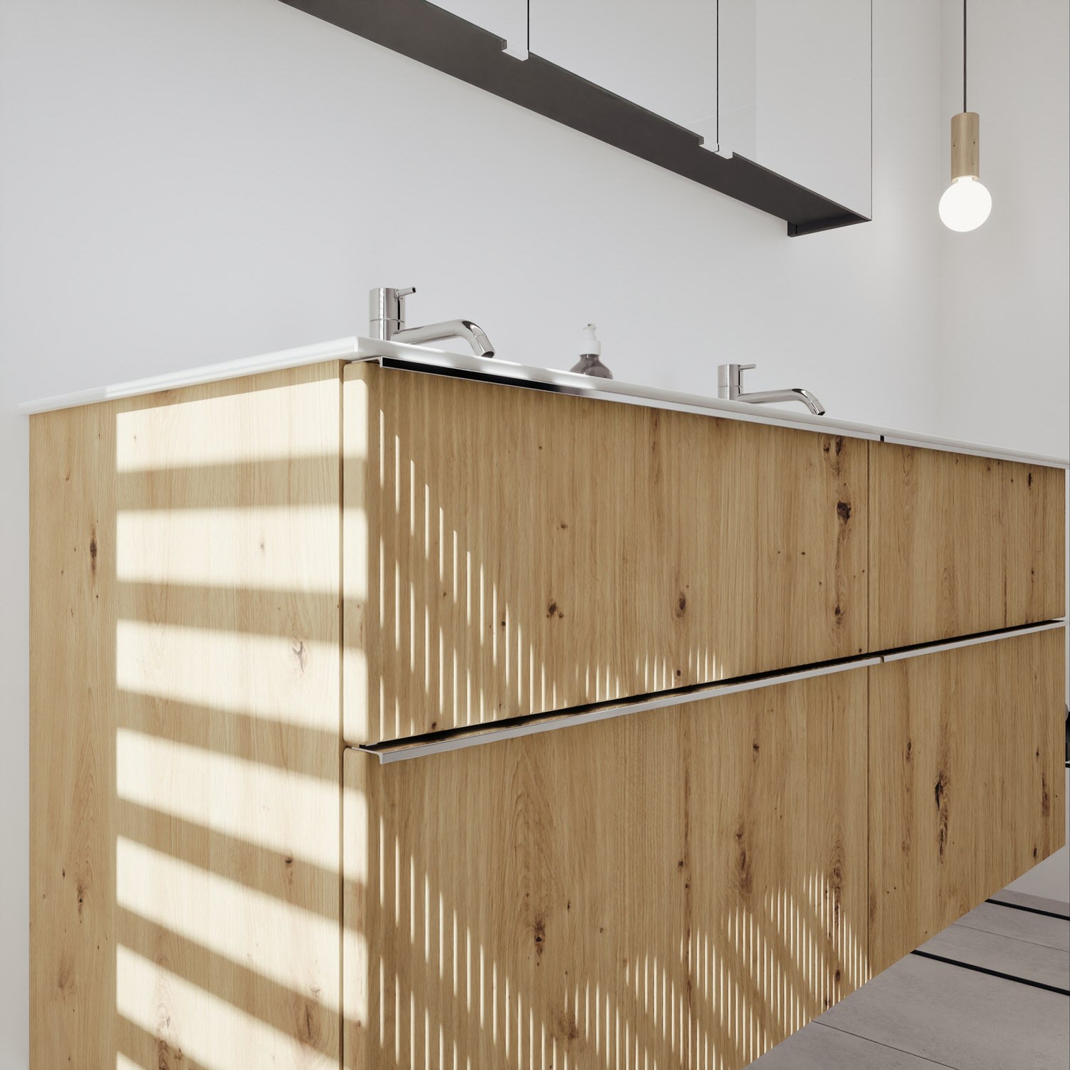 - 2 Schubladen oben, 35 cm tief, mit vertikaler Struktur inkl. mit Siphonausschnitt und Inneneinteilung