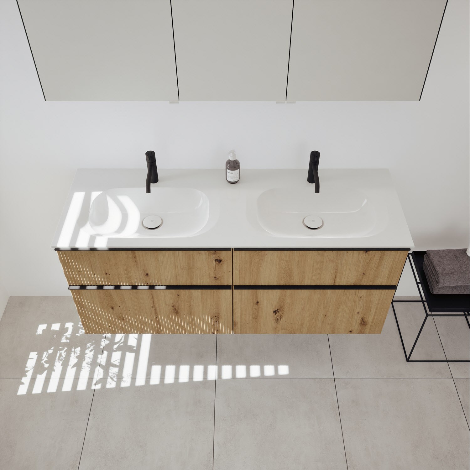 - 2 Schubladen oben, 35 cm tief, mit vertikaler Struktur inkl. mit Siphonausschnitt und Inneneinteilung
