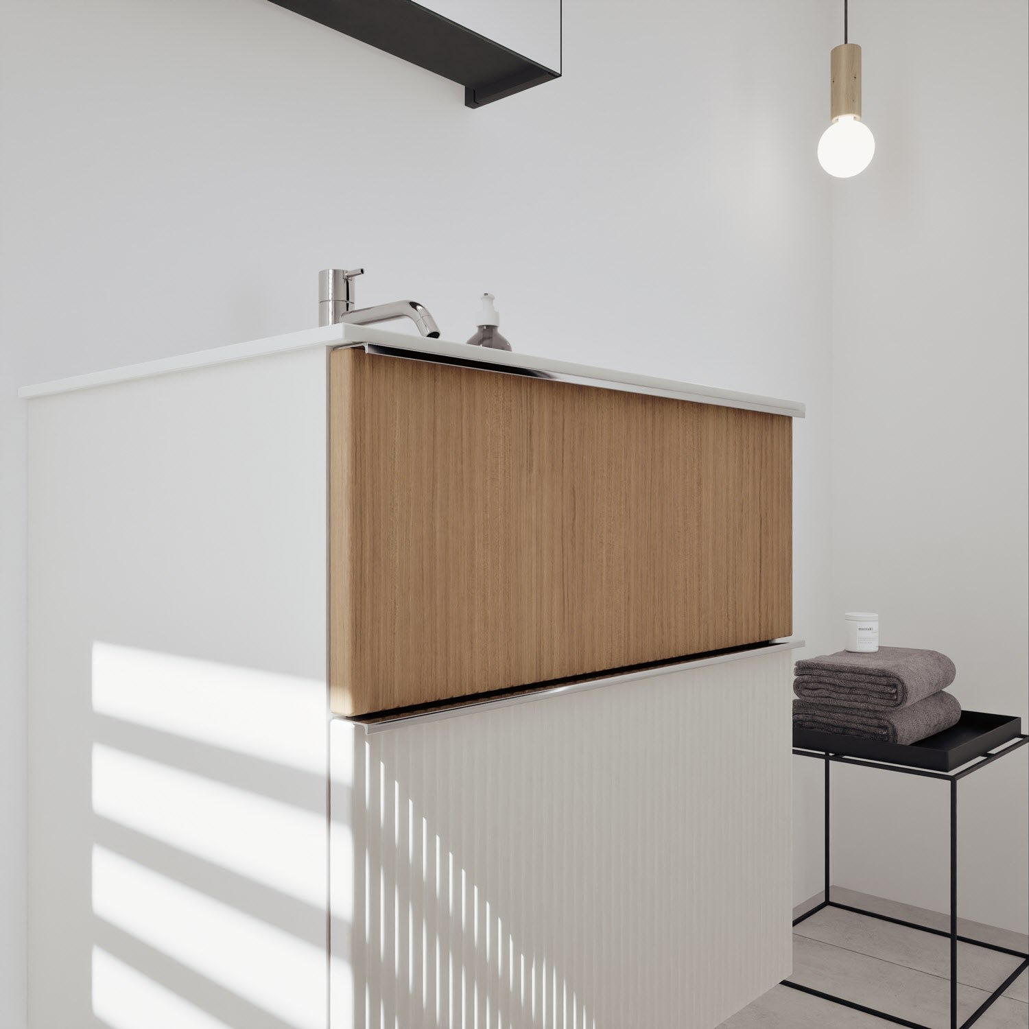 - 1 Schublade oben, 35 cm tief, mit vertikaler Struktur inkl. Siphonausschnitt und Inneneinteilung