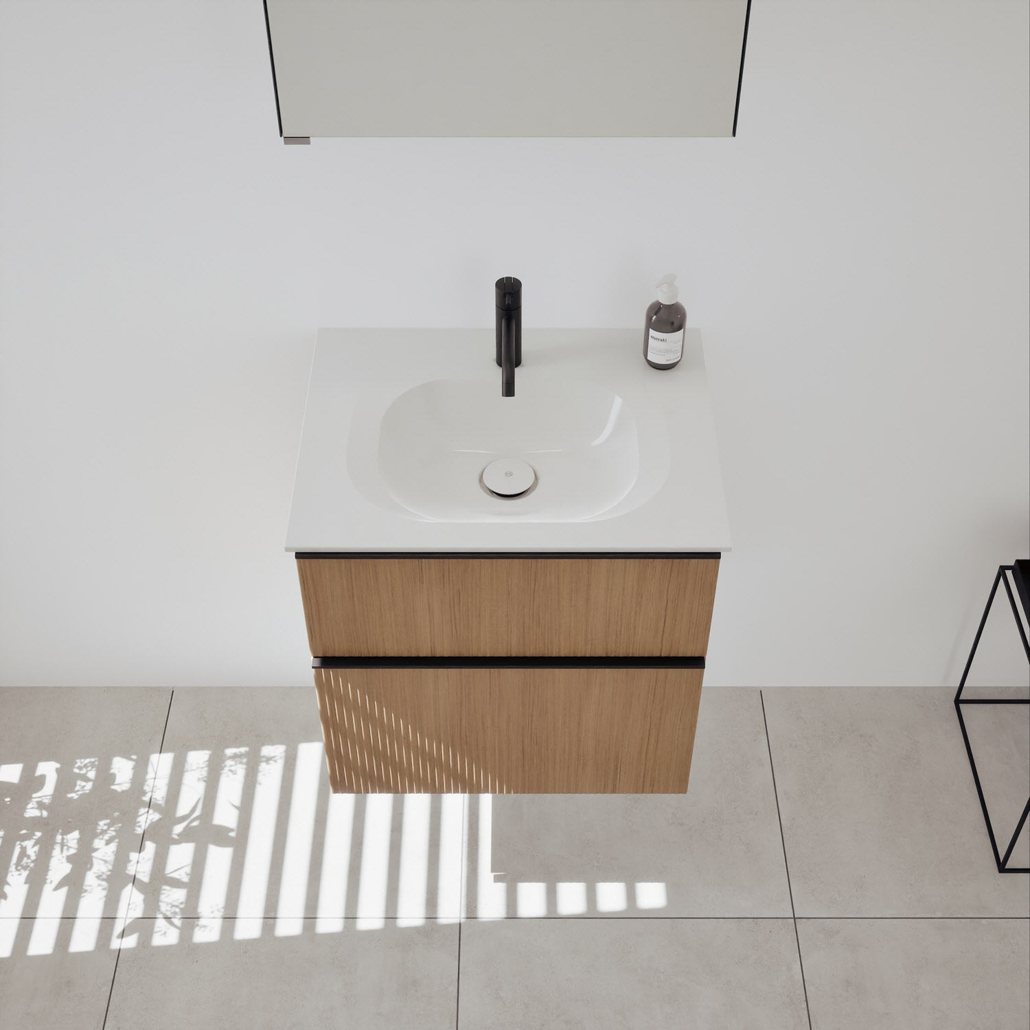 - 1 Schublade oben, 35 cm tief, mit vertikaler Struktur inkl. Siphonausschnitt und Inneneinteilung
