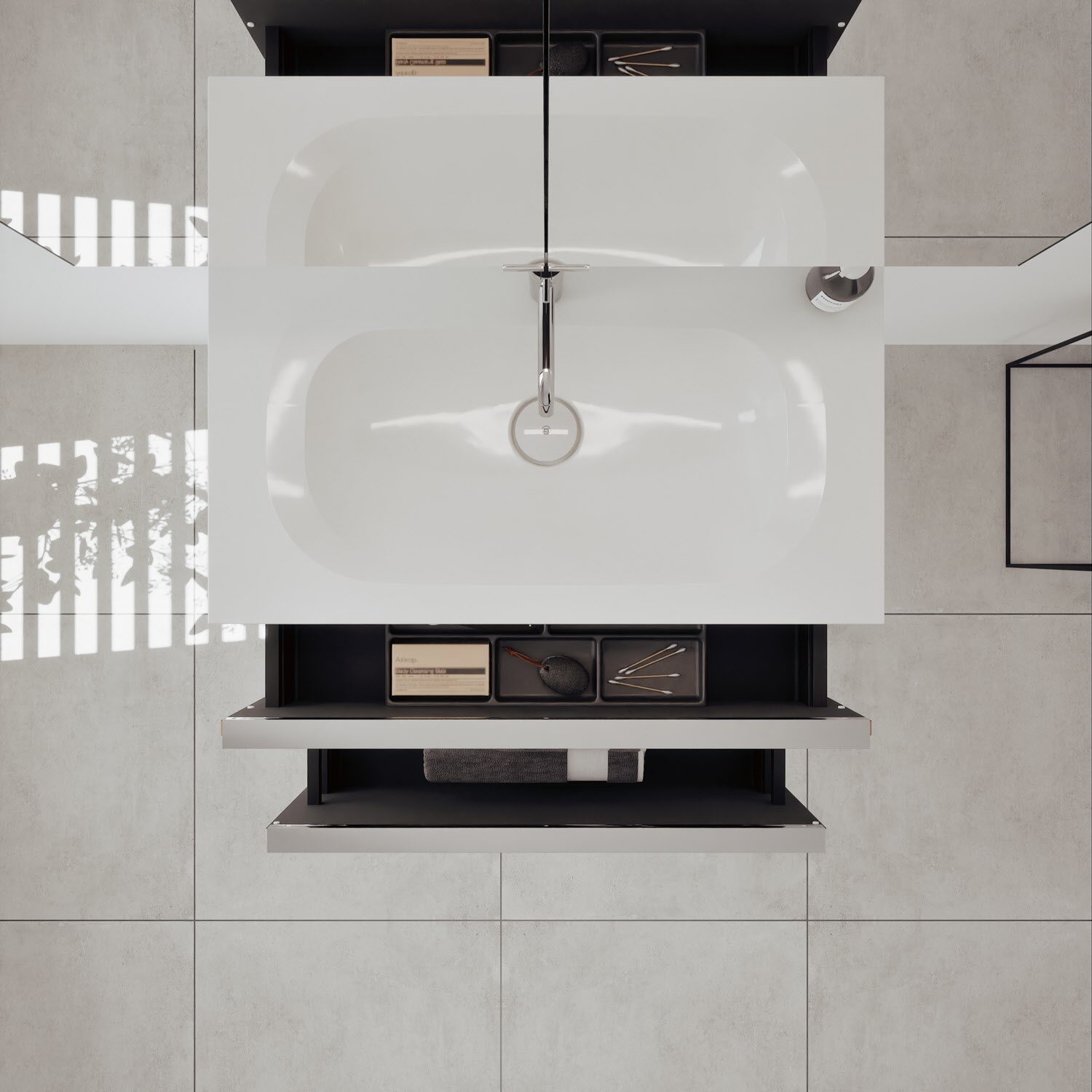 - 1 Schublade oben, 35 cm tief, mit vertikaler Struktur inkl. Siphonausschnitt und Inneneinteilung