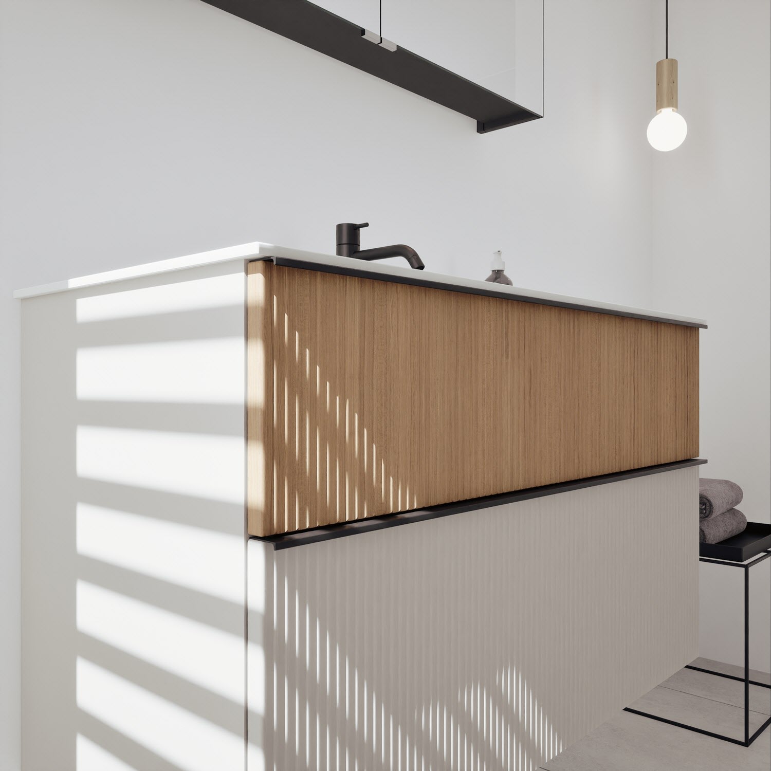 - 1 Schublade oben, 35 cm tief, mit vertikaler Struktur inkl. Siphonausschnitt und Inneneinteilung