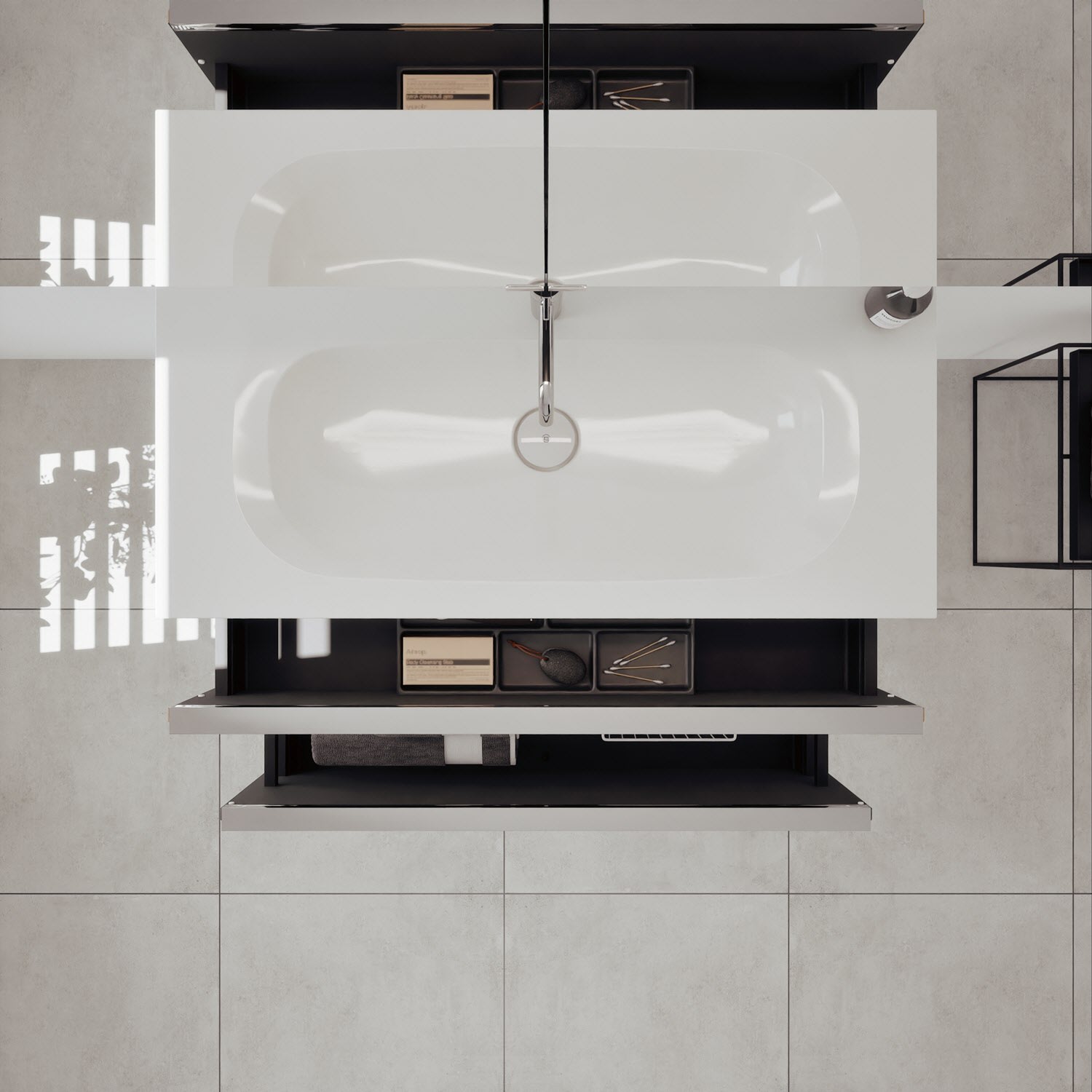 - 1 Schublade oben, 35 cm tief, mit vertikaler Struktur inkl. Siphonausschnitt und Inneneinteilung