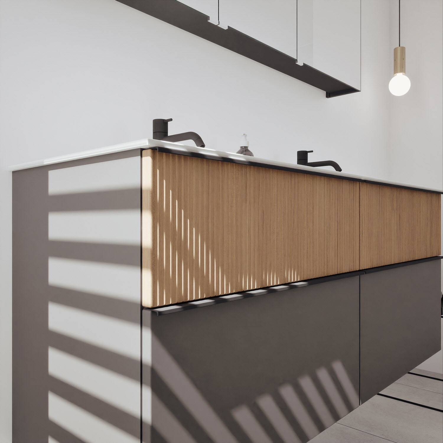 - 2 Schubladen oben, 35 cm tief, mit vertikaler Struktur inkl. mit Siphonausschnitt und Inneneinteilung