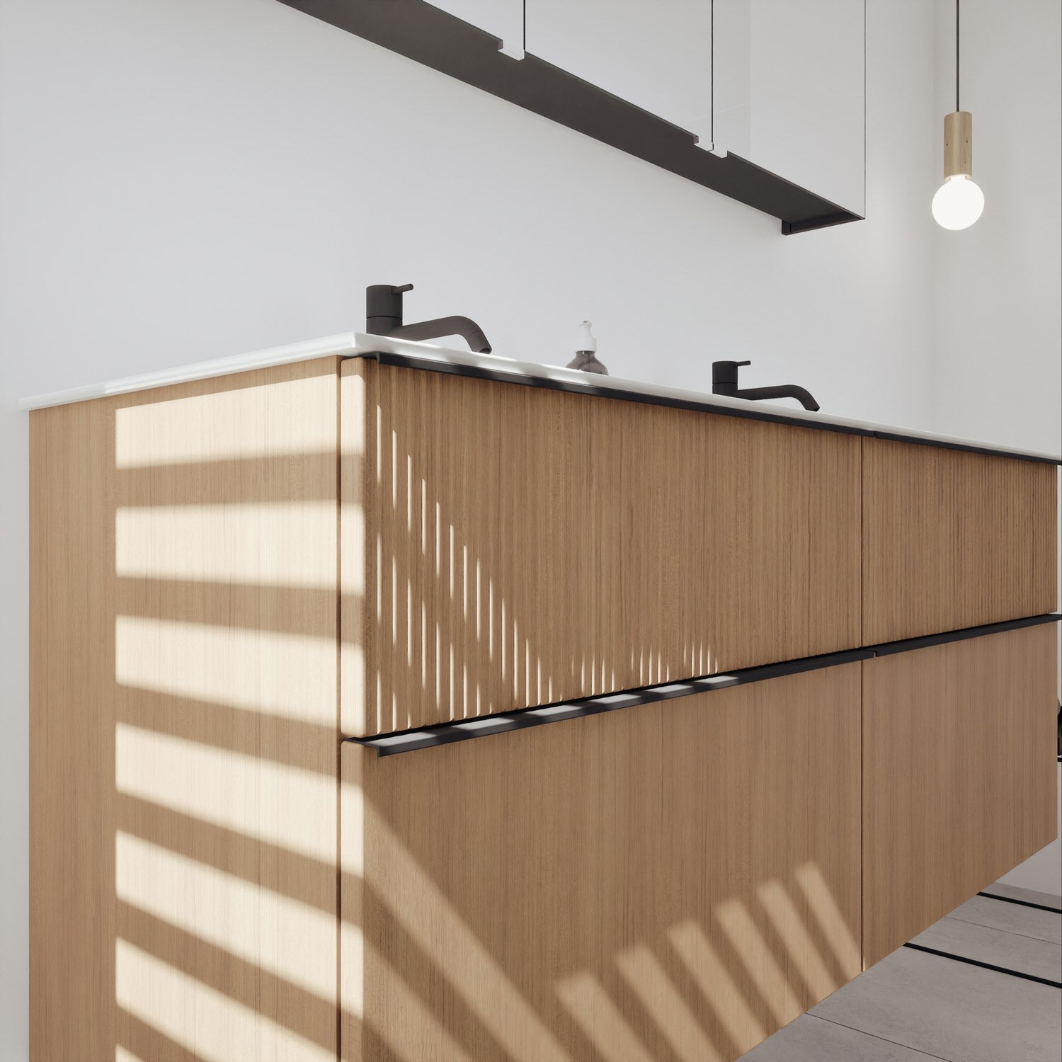 - 2 Schubladen oben, 35 cm tief, mit vertikaler Struktur inkl. mit Siphonausschnitt und Inneneinteilung
