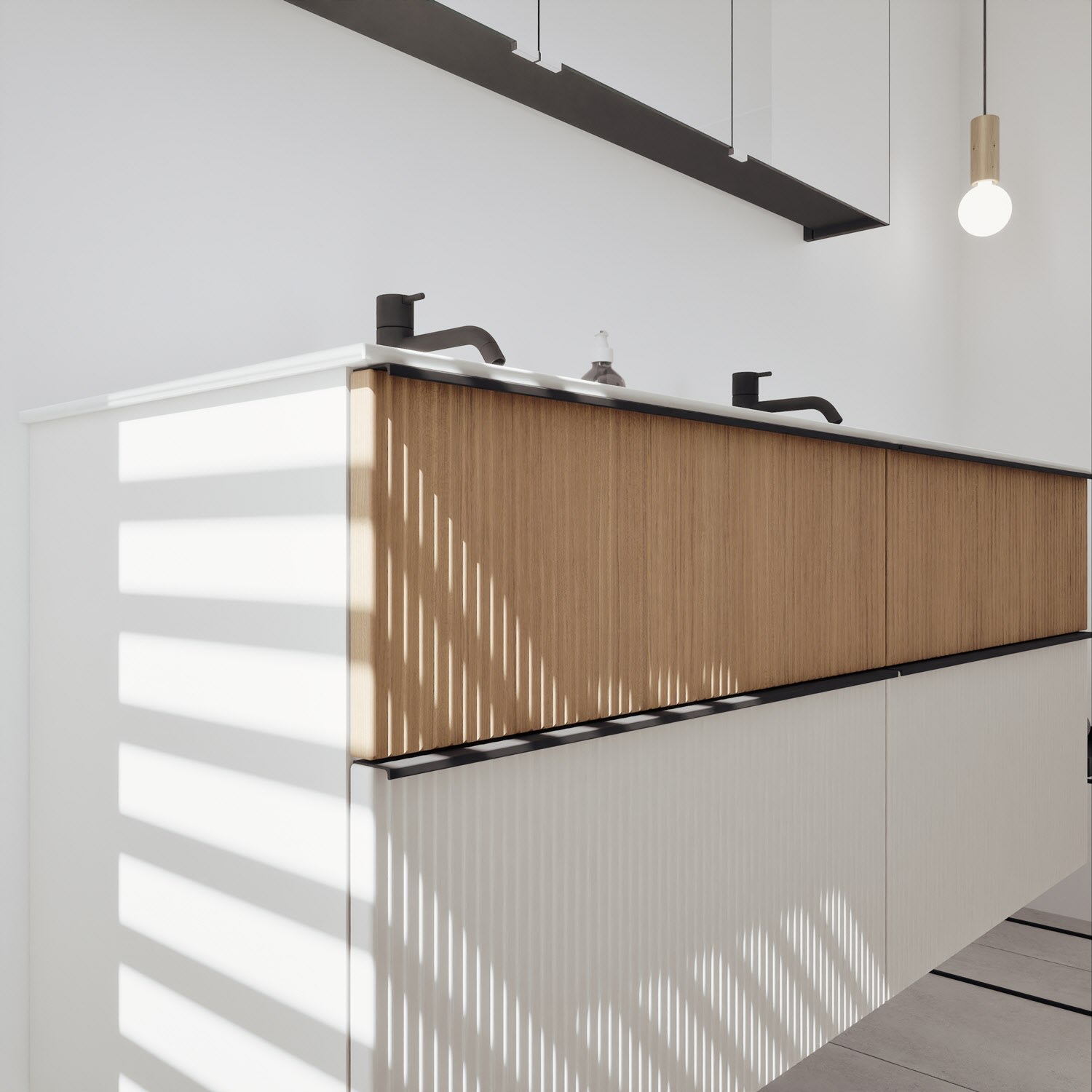 - 2 Schubladen oben, 35 cm tief, mit vertikaler Struktur inkl. mit Siphonausschnitt und Inneneinteilung