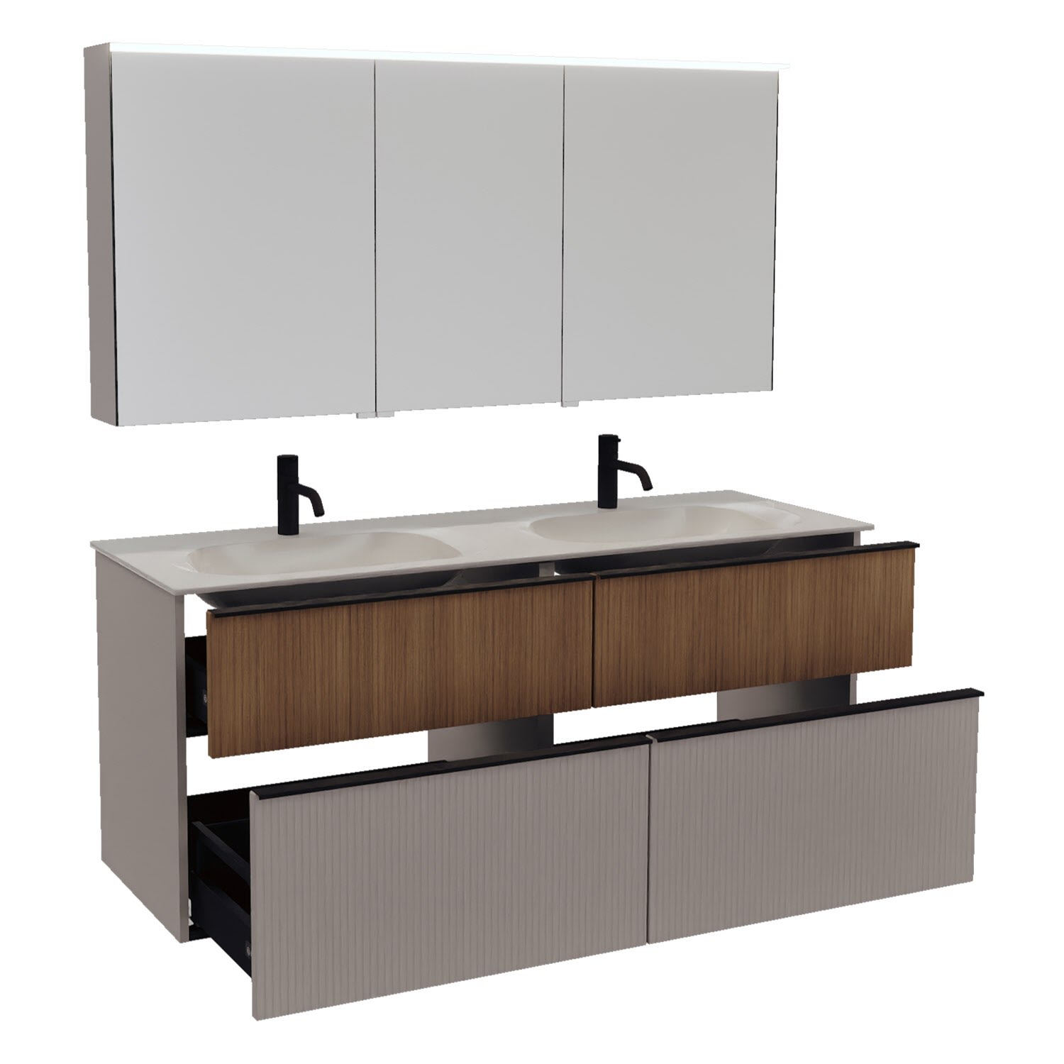 - 2 Schubladen oben, 35 cm tief, mit vertikaler Struktur inkl. mit Siphonausschnitt und Inneneinteilung