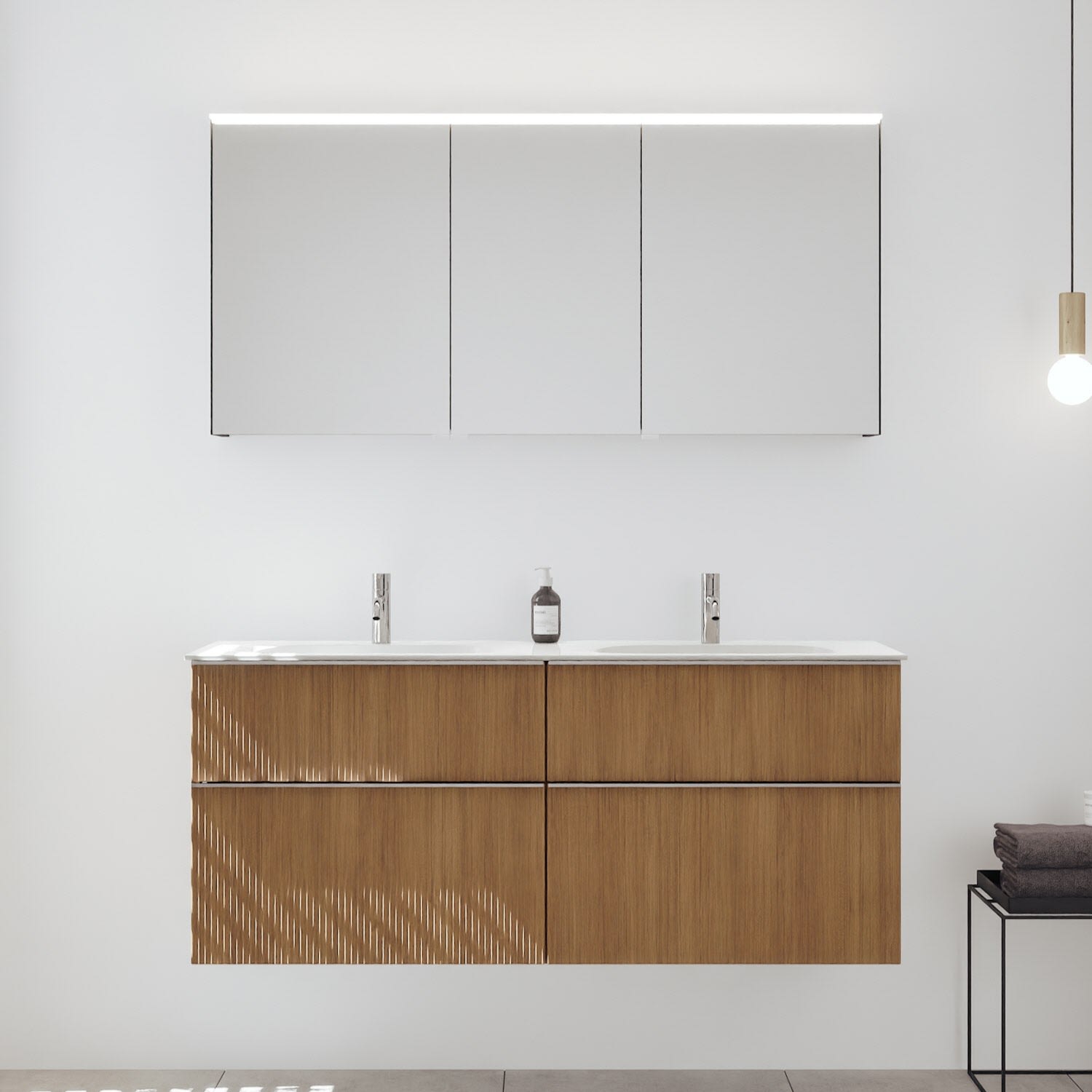 - 2 Schubladen oben, 35 cm tief, mit vertikaler Struktur inkl. mit Siphonausschnitt und Inneneinteilung
