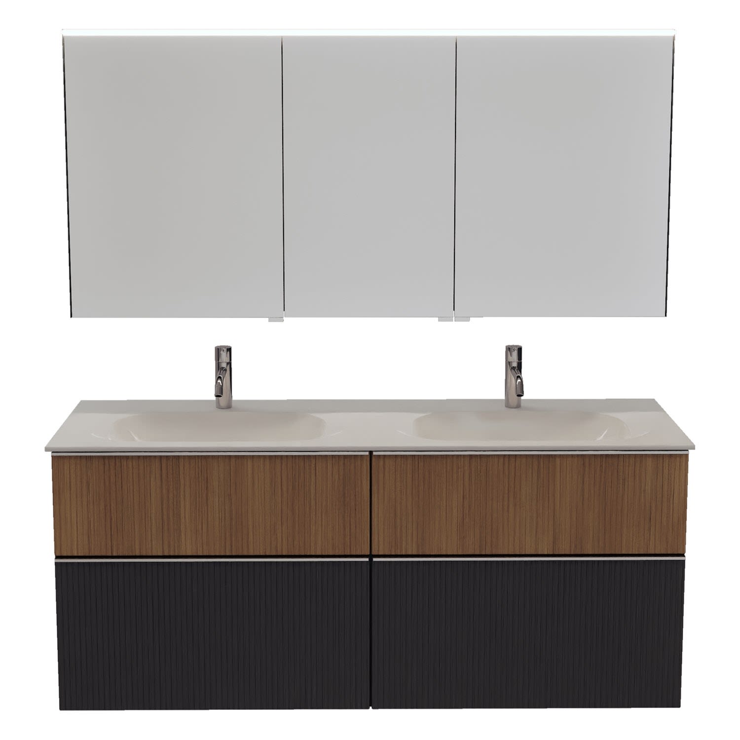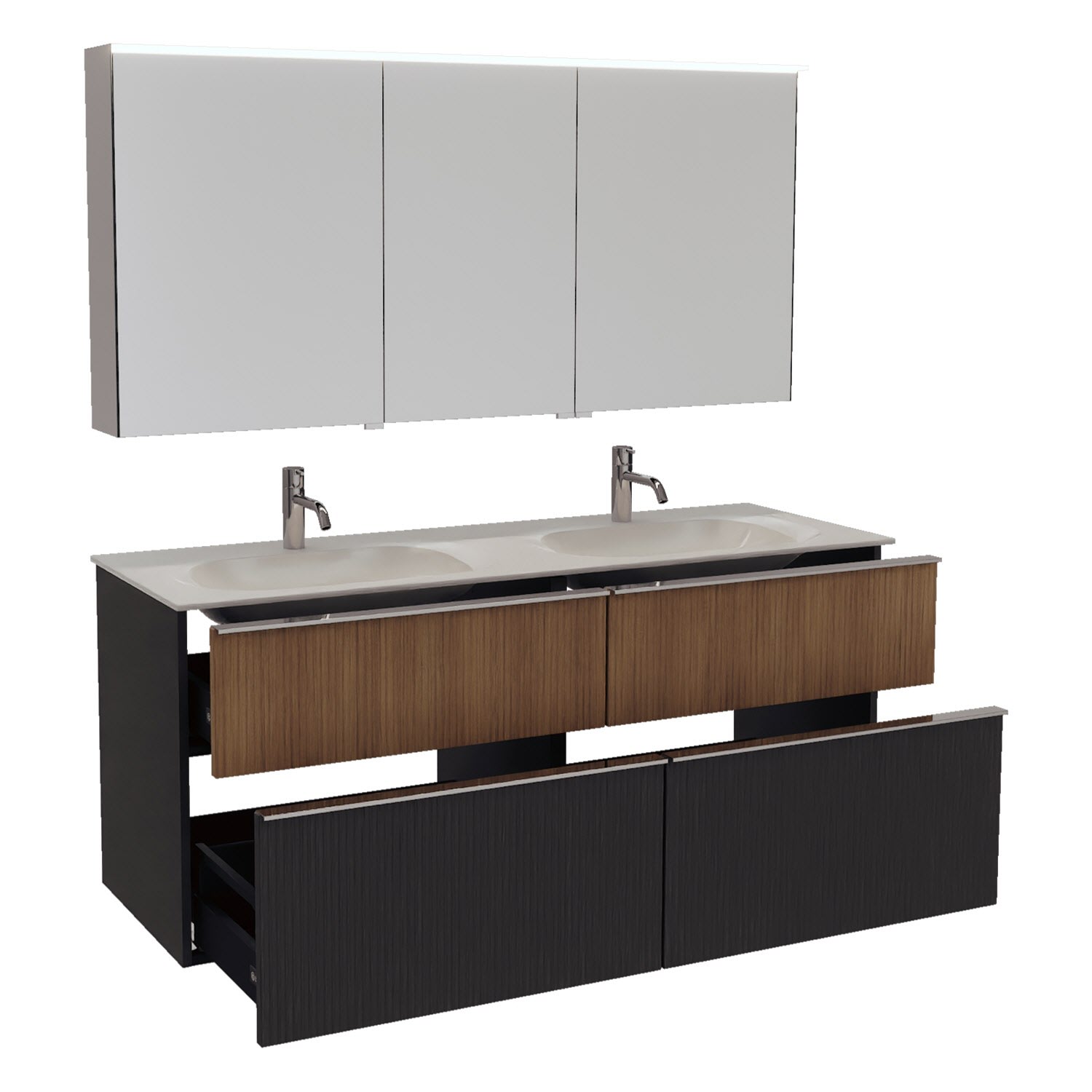 - 2 Schubladen oben, 35 cm tief, mit vertikaler Struktur inkl. mit Siphonausschnitt und Inneneinteilung