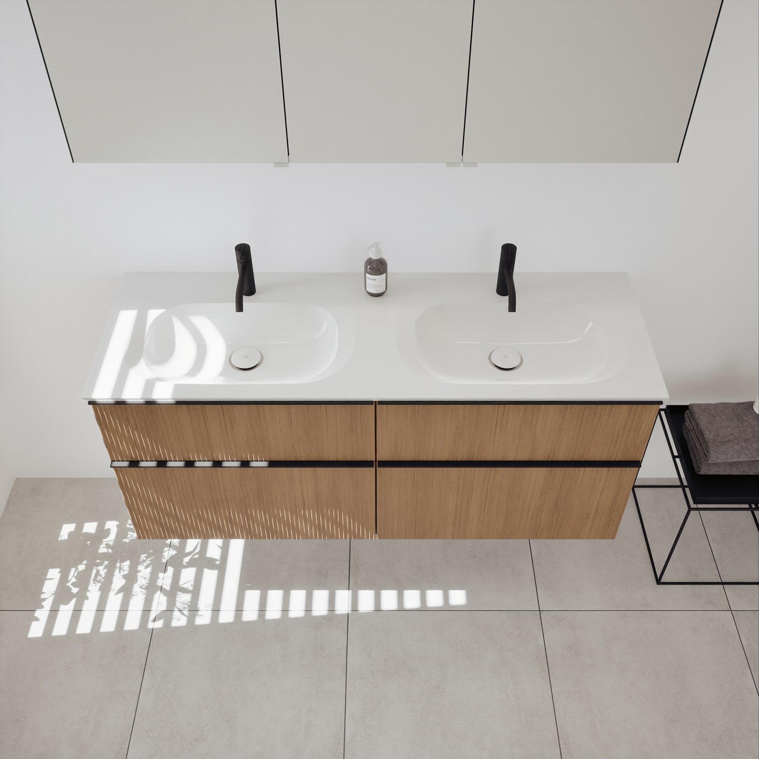 - 2 Schubladen oben, 35 cm tief, mit vertikaler Struktur inkl. mit Siphonausschnitt und Inneneinteilung