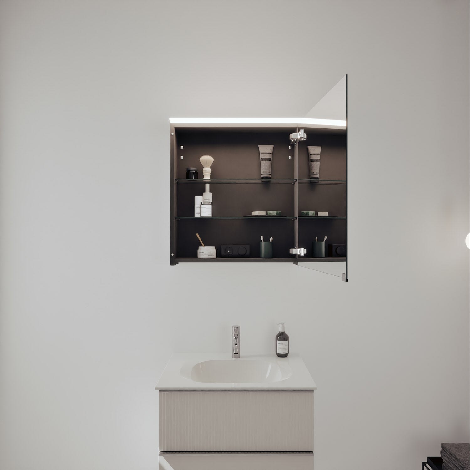 - Spiegelschrank, Befestigung, Einlegeböden, LED-Beleuchtung