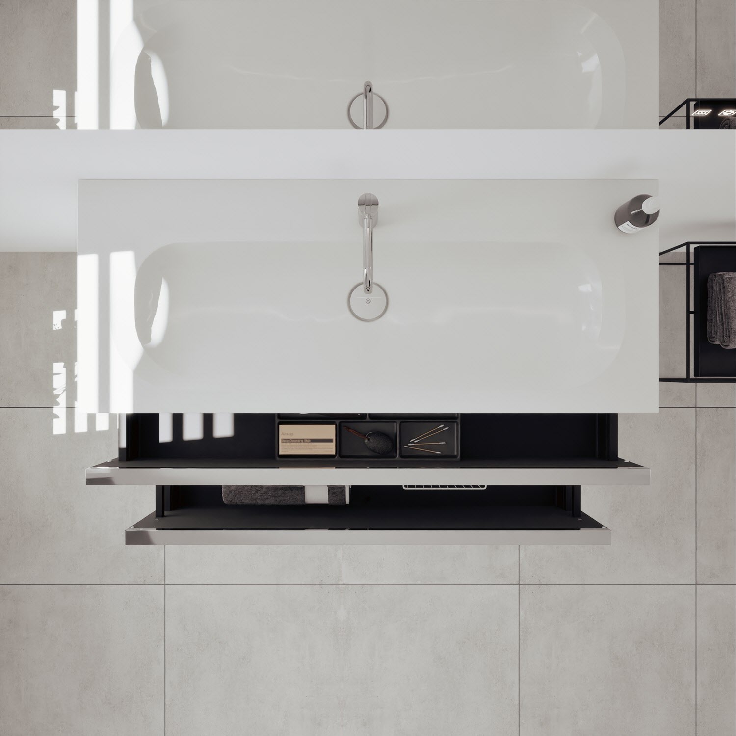 - 1 Schublade oben, 35 cm tief, mit Siphonausschnitt und Inneneinteilung