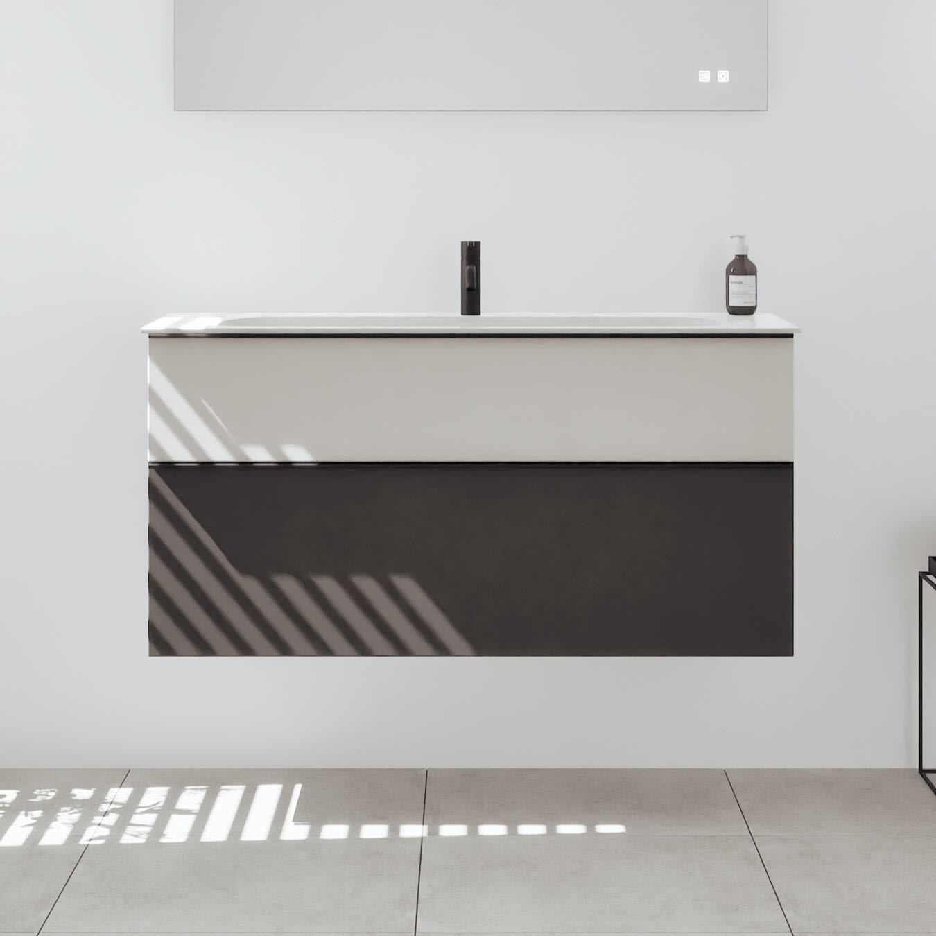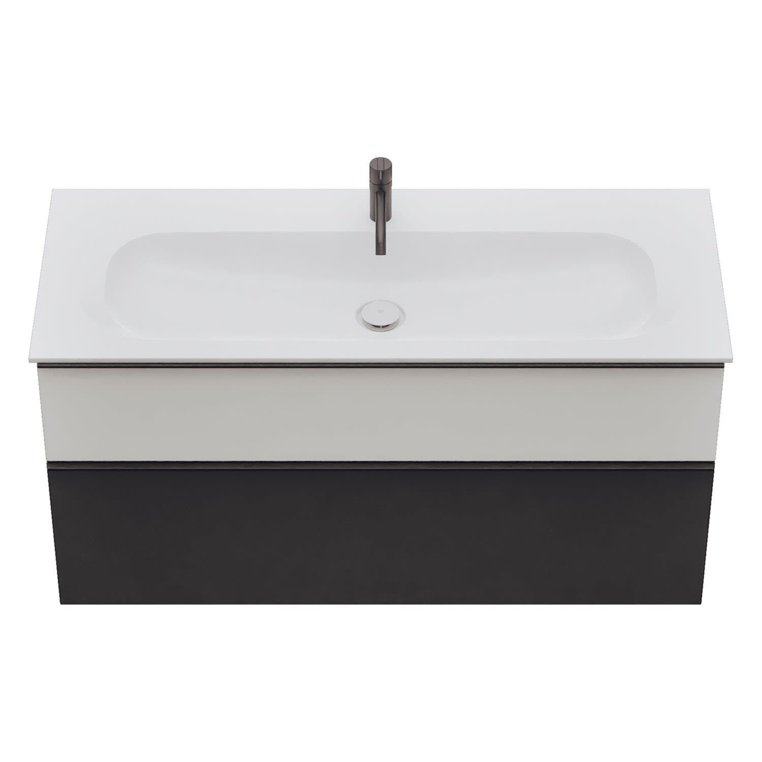 - 1 Schublade oben, 35 cm tief, mit Siphonausschnitt und Inneneinteilung