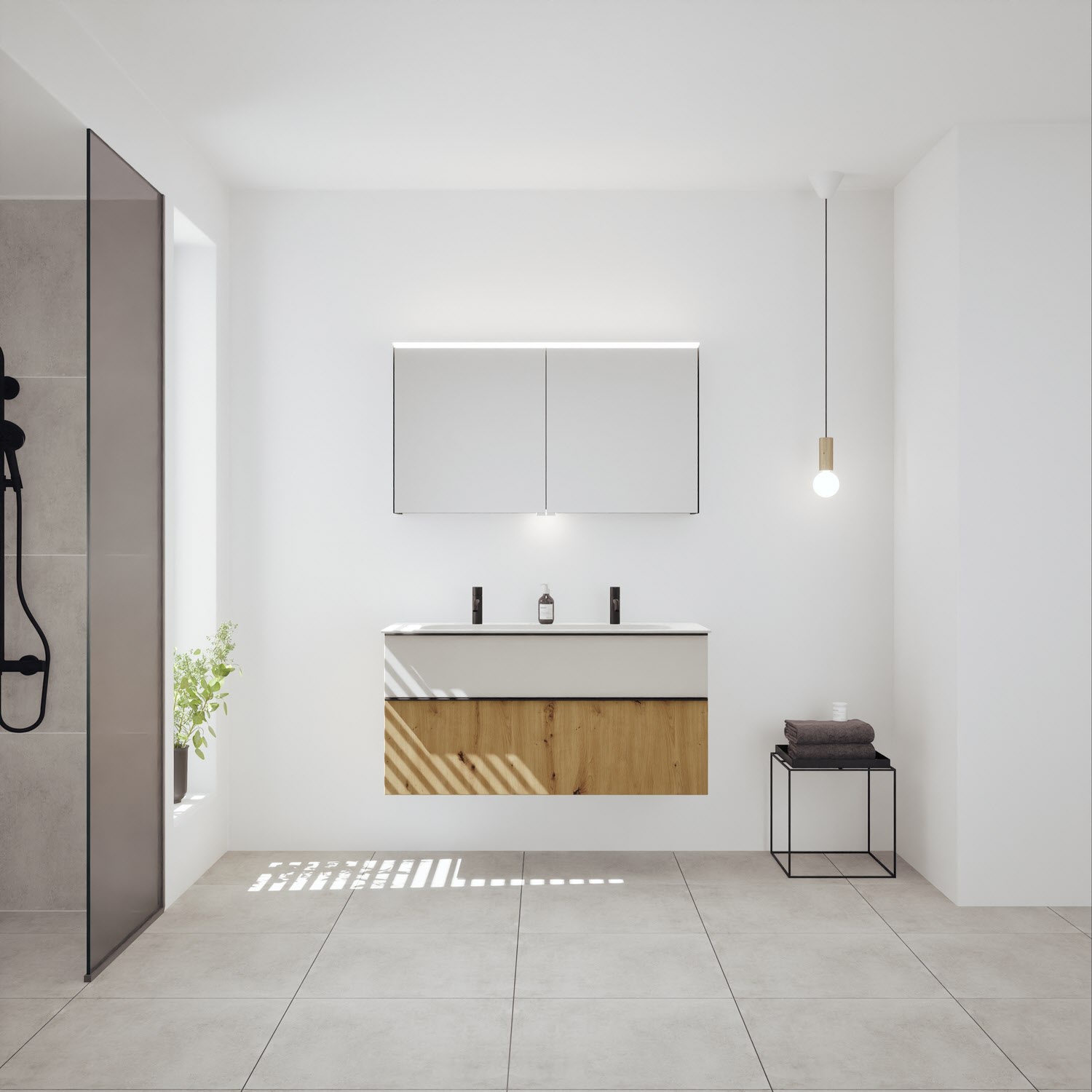 burgbad Fiumo 2.0 Spiegelschrank 120,6 cm mit LED-Aufsatzleuchte und Waschplatzbeleuchtung, 2 Spiegeltüren