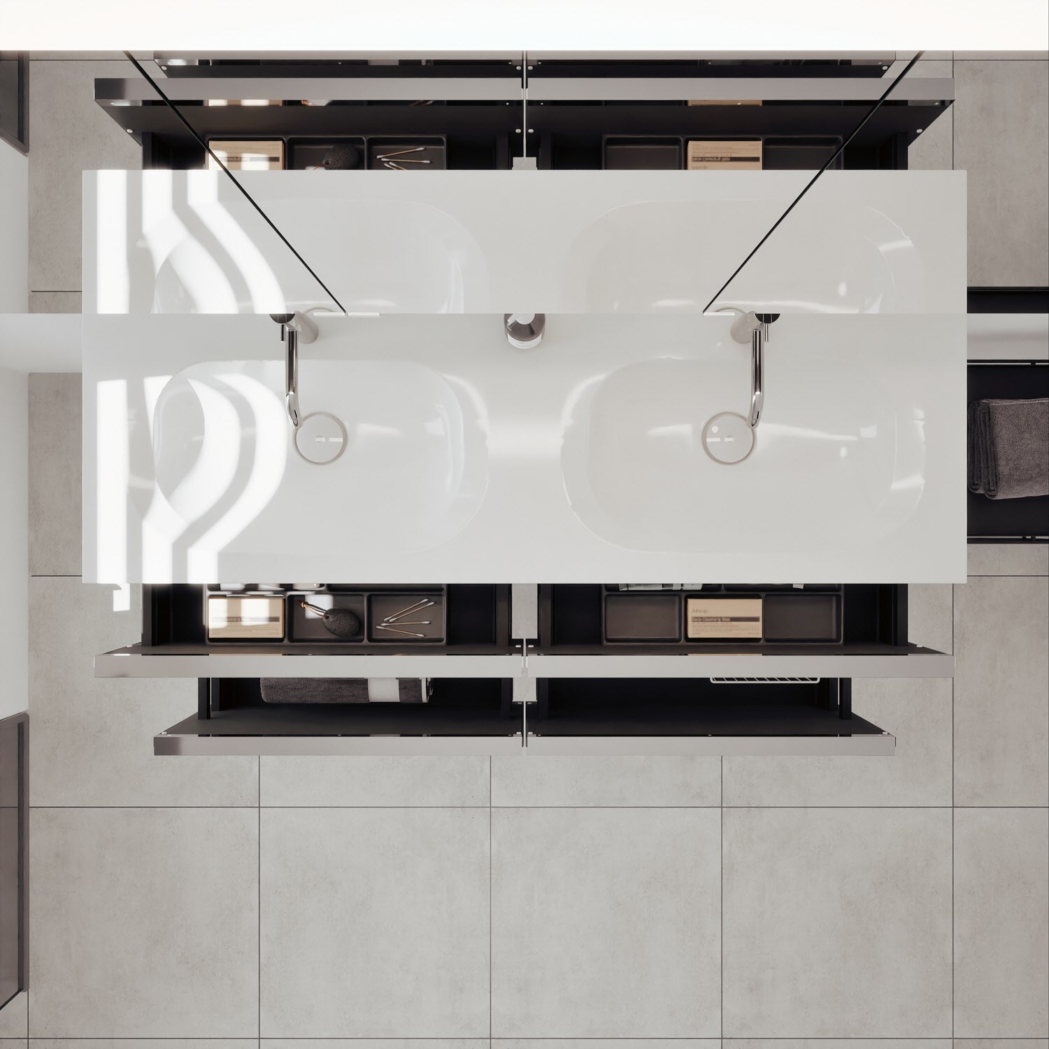 - 2 Schubladen oben, 35 cm tief, mit Siphonausschnitt und Inneneinteilung