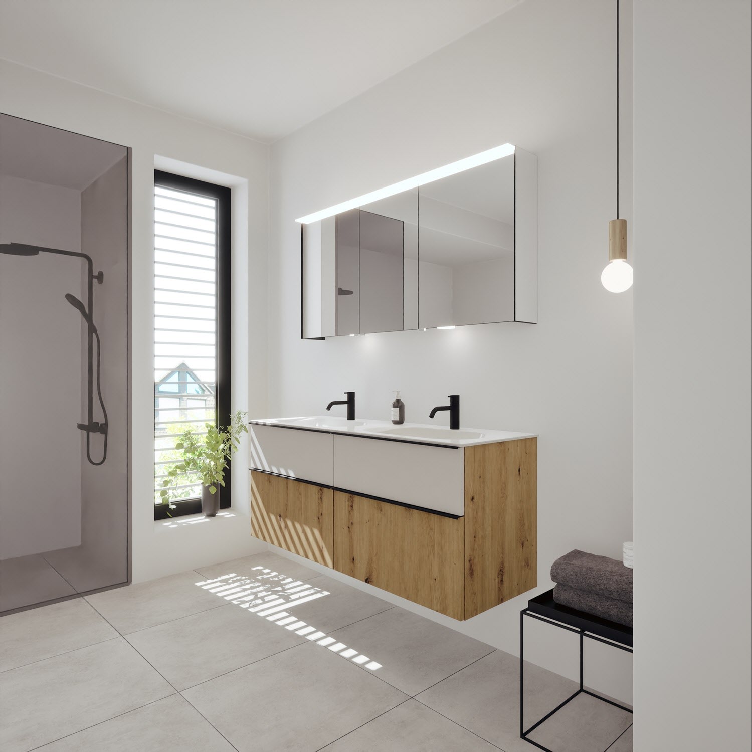 burgbad Fiumo 2.0 Spiegelschrank 140,6 cm mit LED-Aufsatzleuchte und Waschplatzbeleuchtung, 3 Spiegeltüren