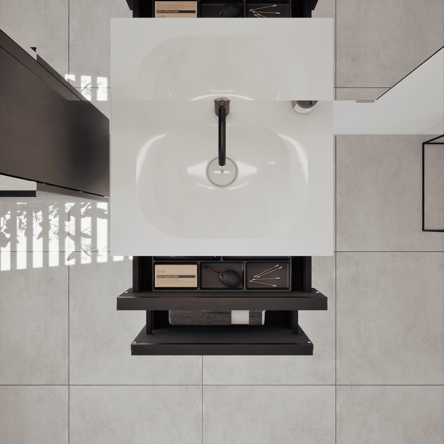 - 1 Schublade oben, 35 cm tief, mit Siphonausschnitt und Inneneinteilung