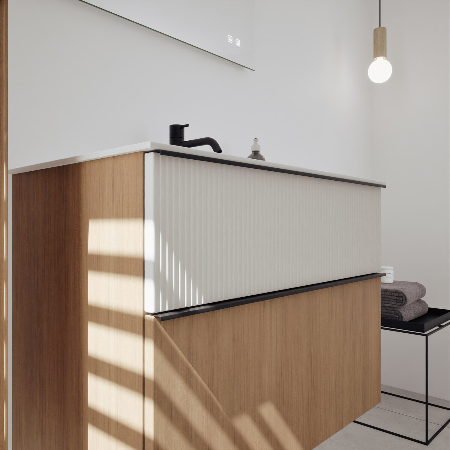 - 1 Schublade oben, 35 cm tief, mit vertikaler Struktur inkl. Siphonausschnitt und Inneneinteilung