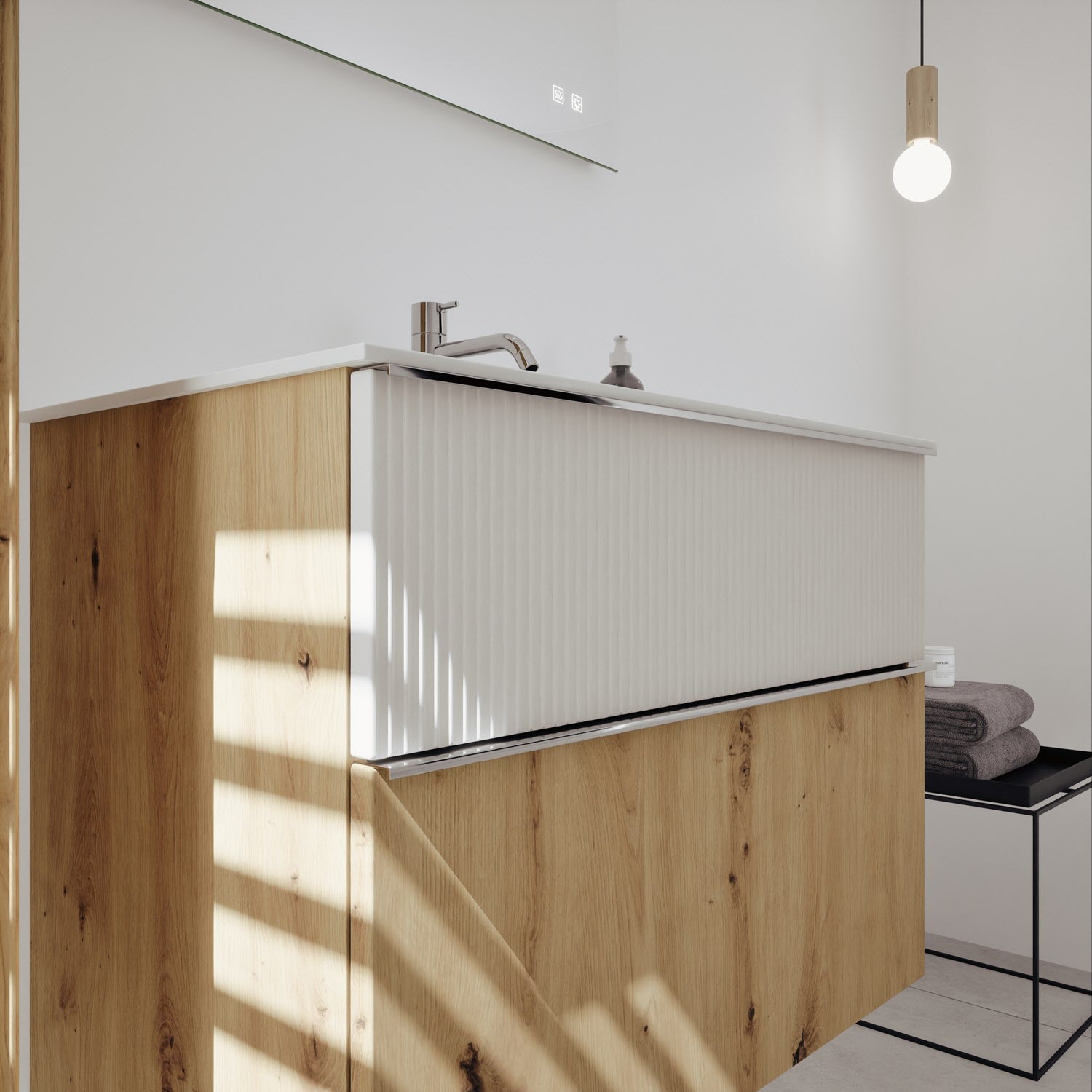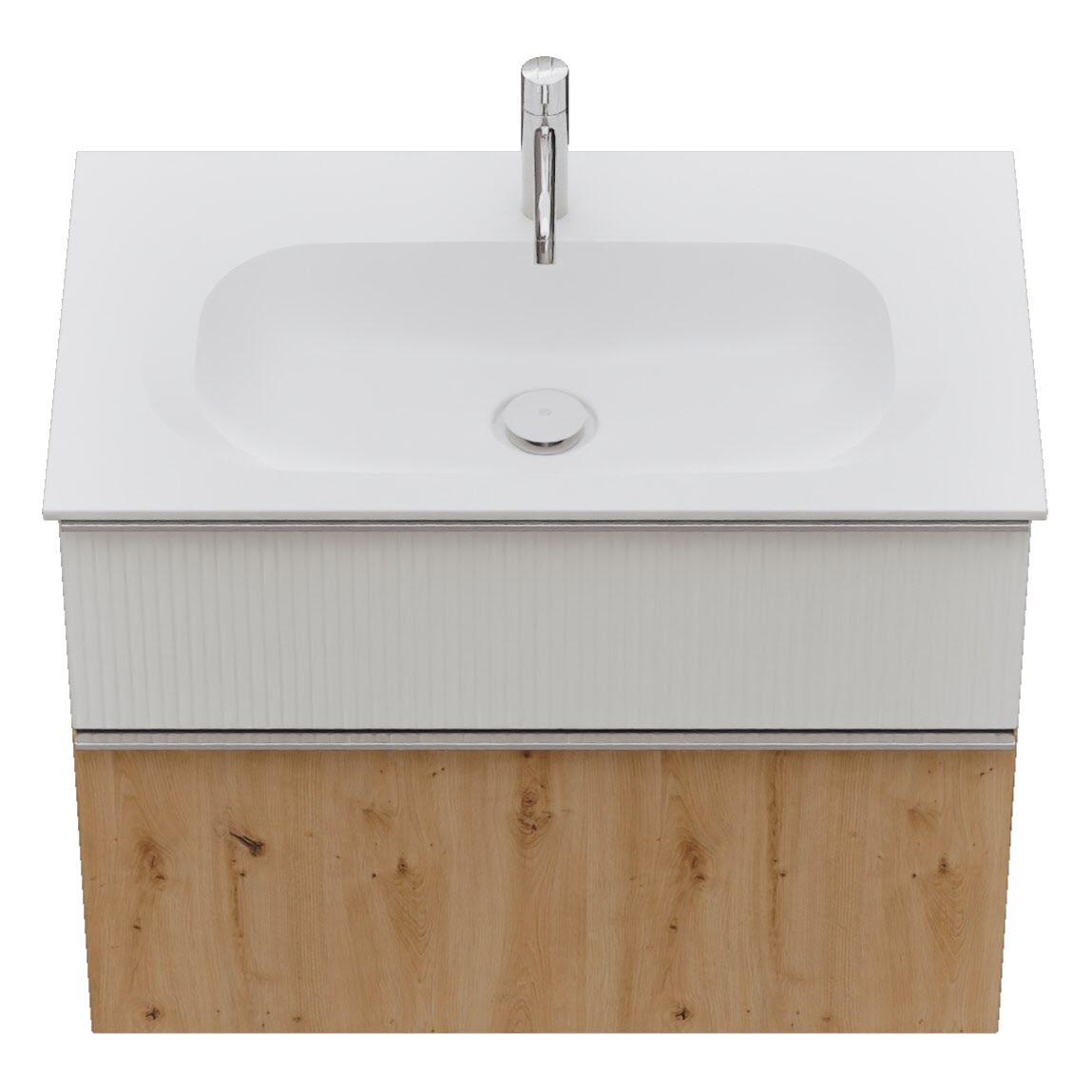 - 1 Schublade oben, 35 cm tief, mit vertikaler Struktur inkl. Siphonausschnitt und Inneneinteilung