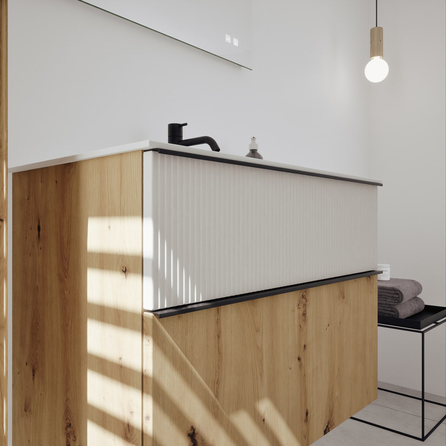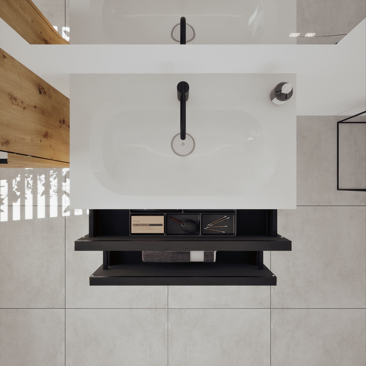 - 1 Schublade oben, 35 cm tief, mit vertikaler Struktur inkl. Siphonausschnitt und Inneneinteilung