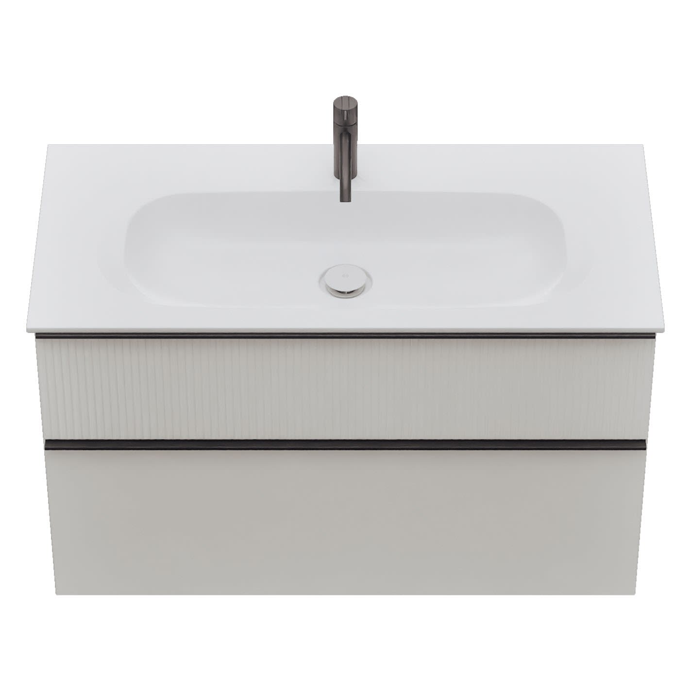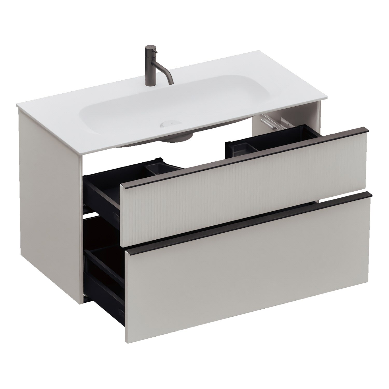 - 1 Schublade oben, 35 cm tief, mit vertikaler Struktur inkl. Siphonausschnitt und Inneneinteilung