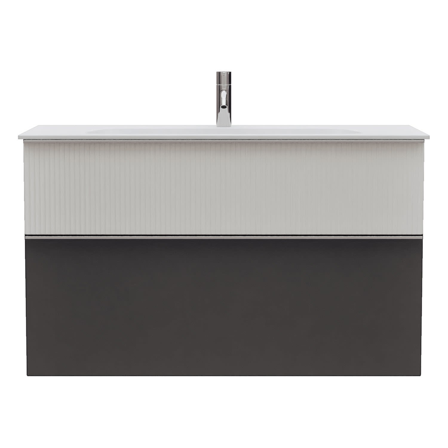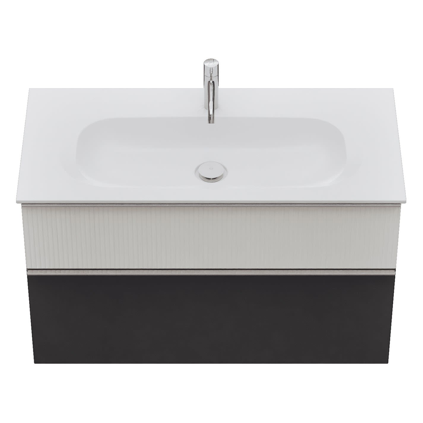 - 1 Schublade oben, 35 cm tief, mit vertikaler Struktur inkl. Siphonausschnitt und Inneneinteilung