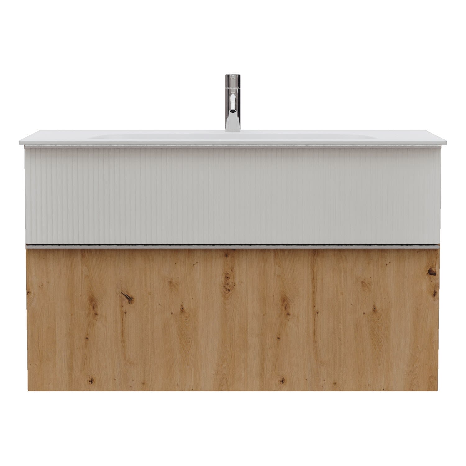 - 1 Schublade oben, 35 cm tief, mit vertikaler Struktur inkl. Siphonausschnitt und Inneneinteilung