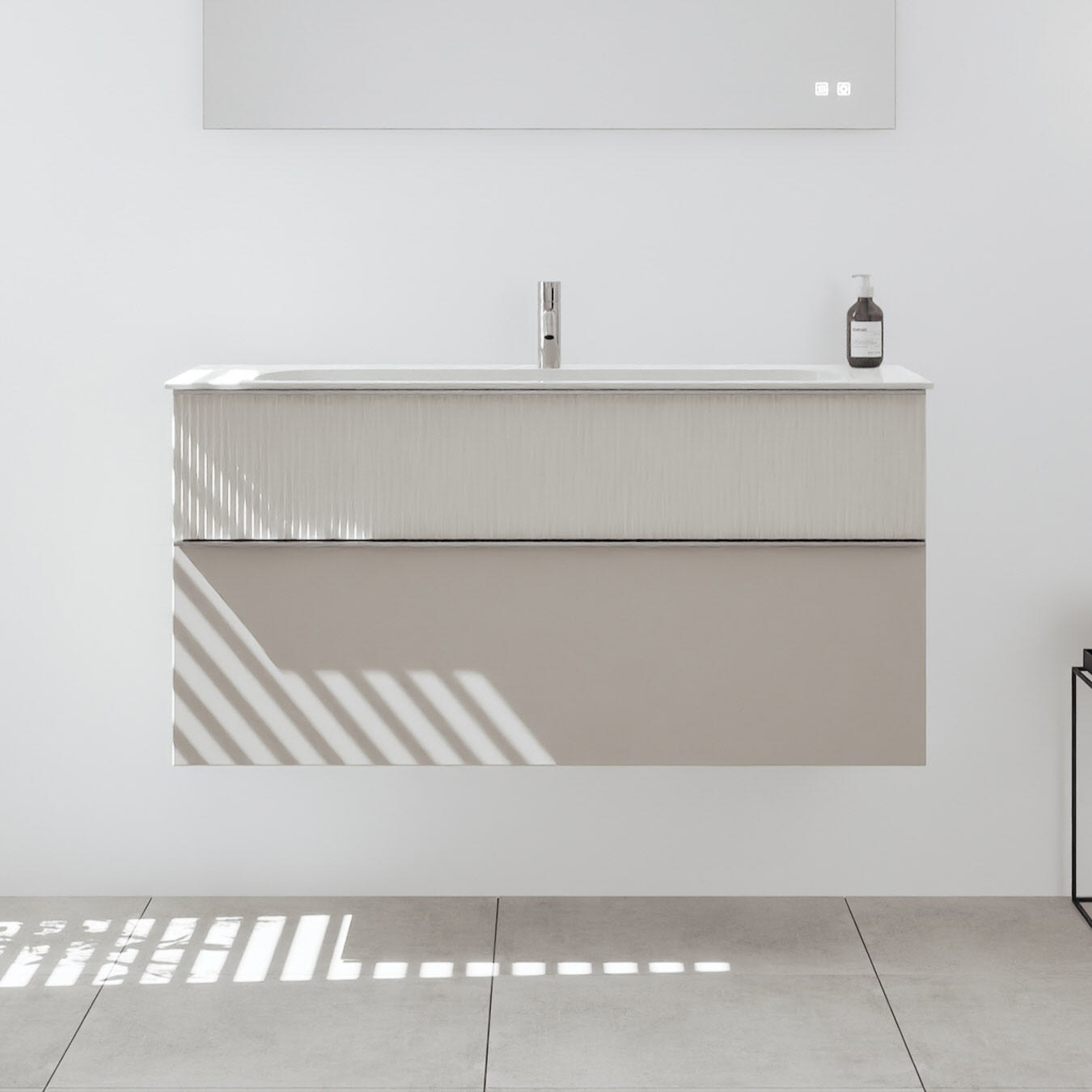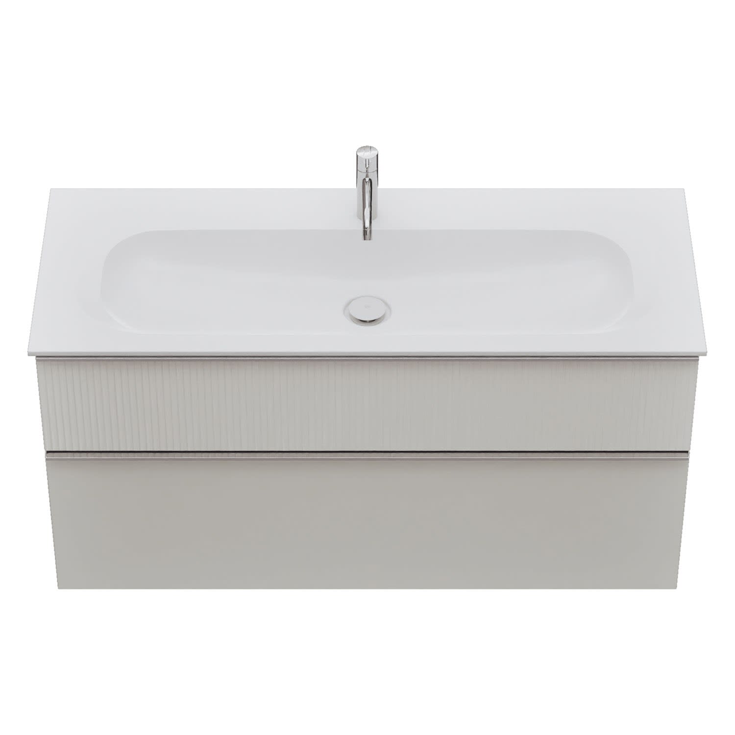 - 1 Schublade oben: 35 cm tief, mit vertikaler Struktur inkl. Siphonausschnitt und Inneneinteilung