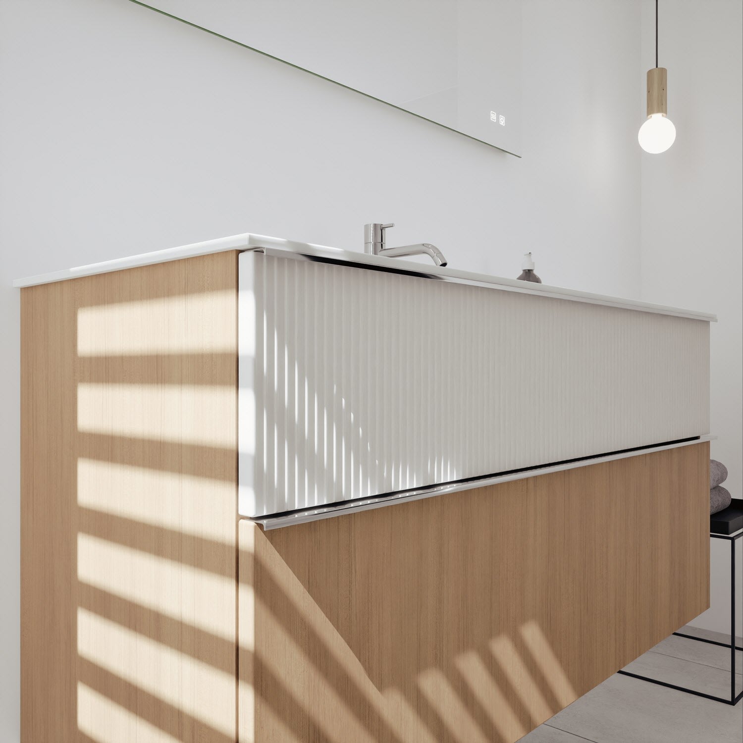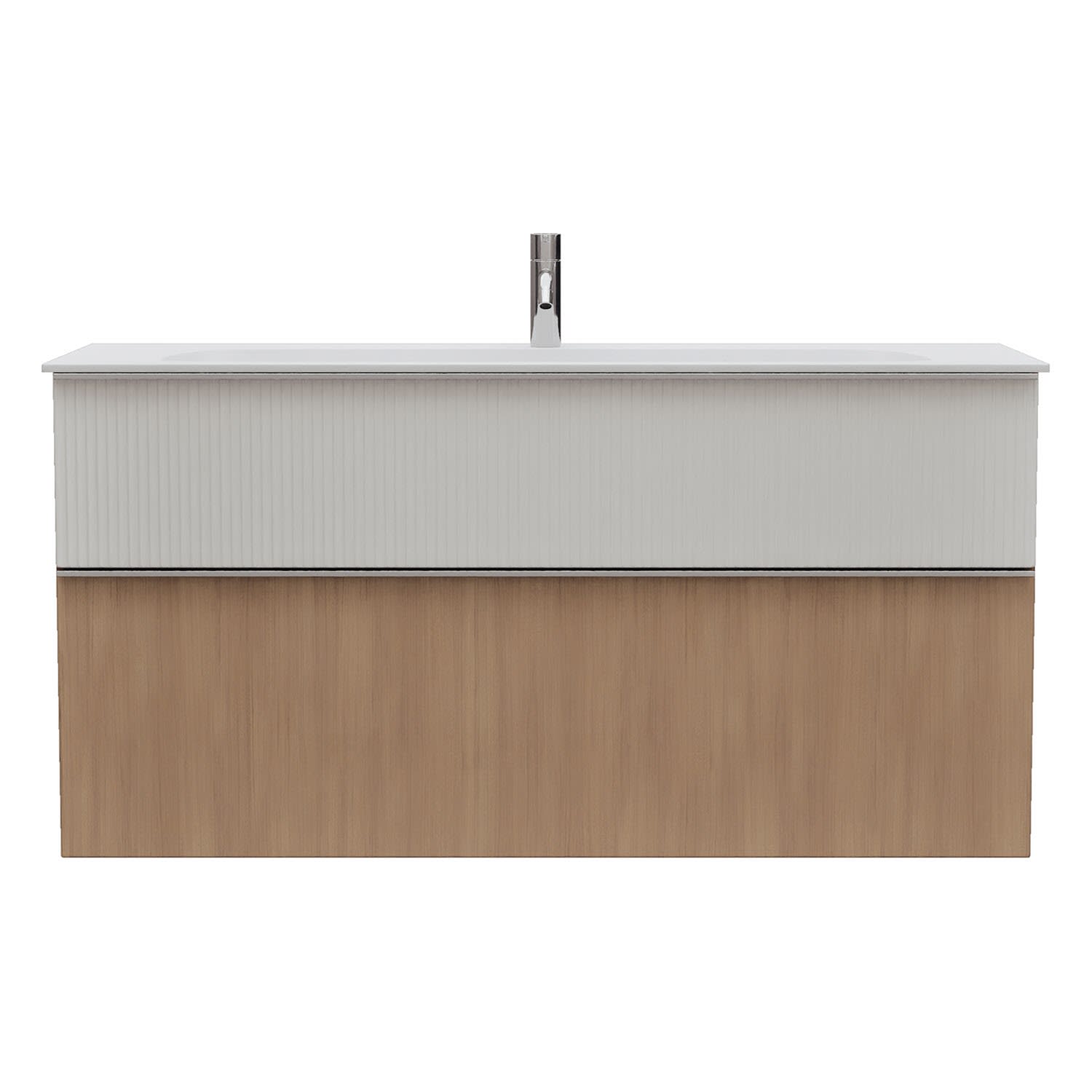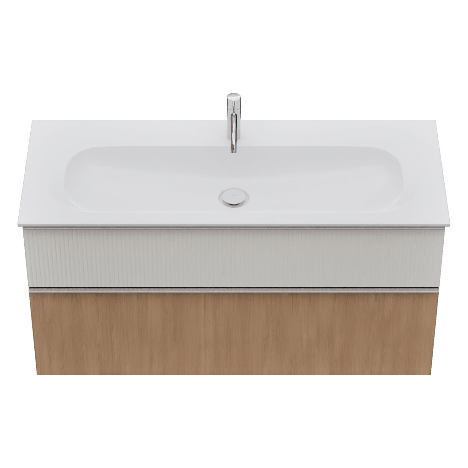 - 1 Schublade oben: 35 cm tief, mit vertikaler Struktur inkl. Siphonausschnitt und Inneneinteilung