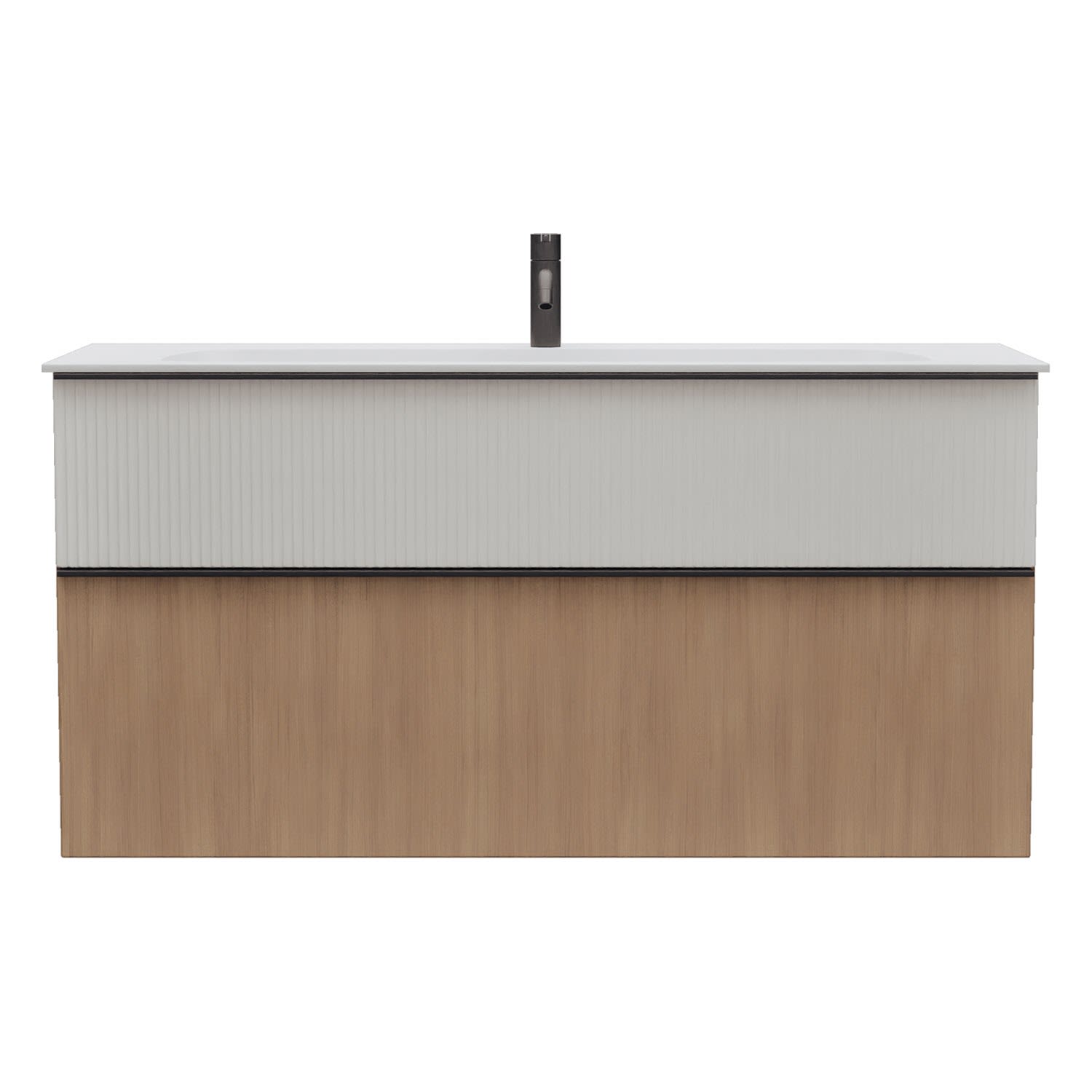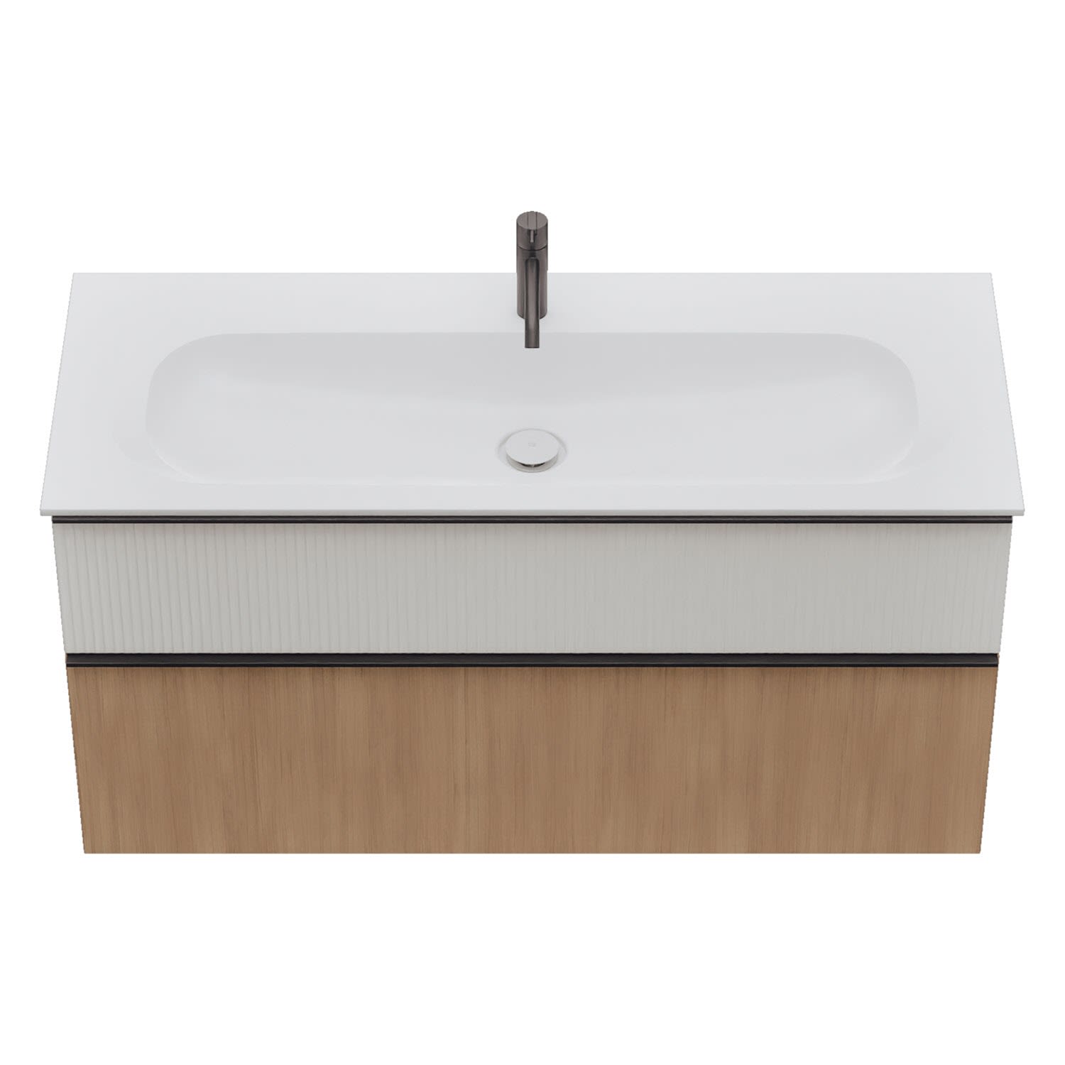 - 1 Schublade oben: 35 cm tief, mit vertikaler Struktur inkl. Siphonausschnitt und Inneneinteilung