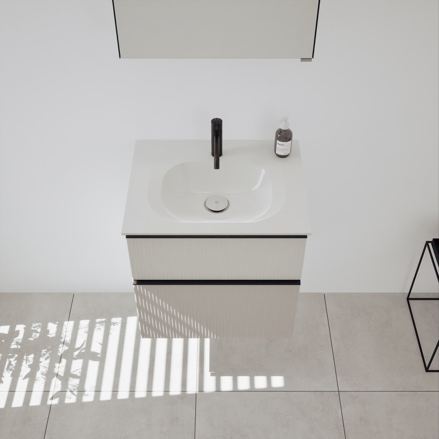 - 1 Schublade oben, 35 cm tief, mit vertikaler Struktur inkl. Siphonausschnitt und Inneneinteilung