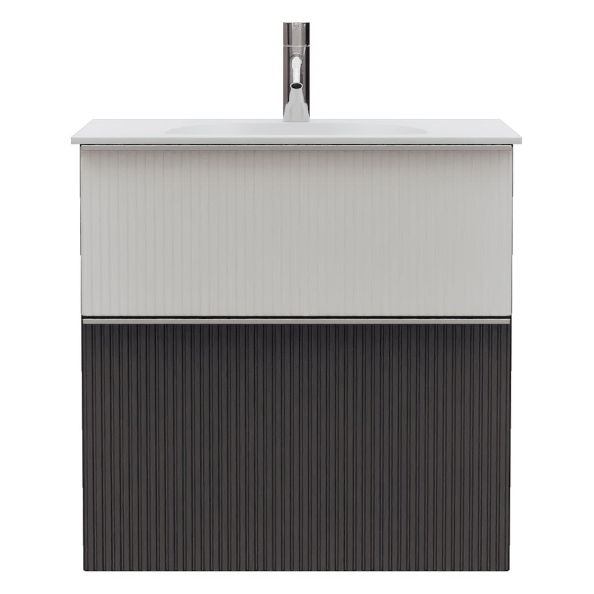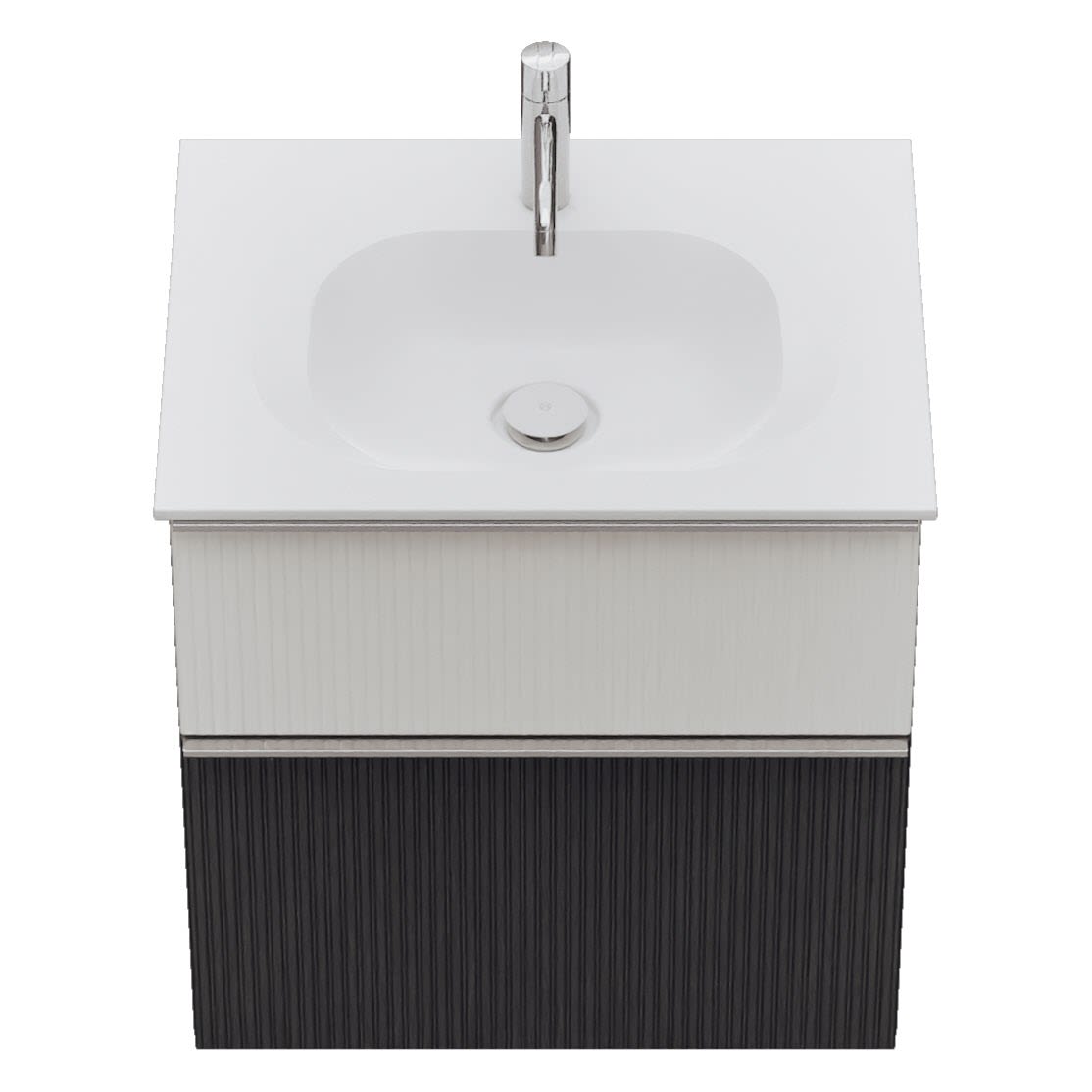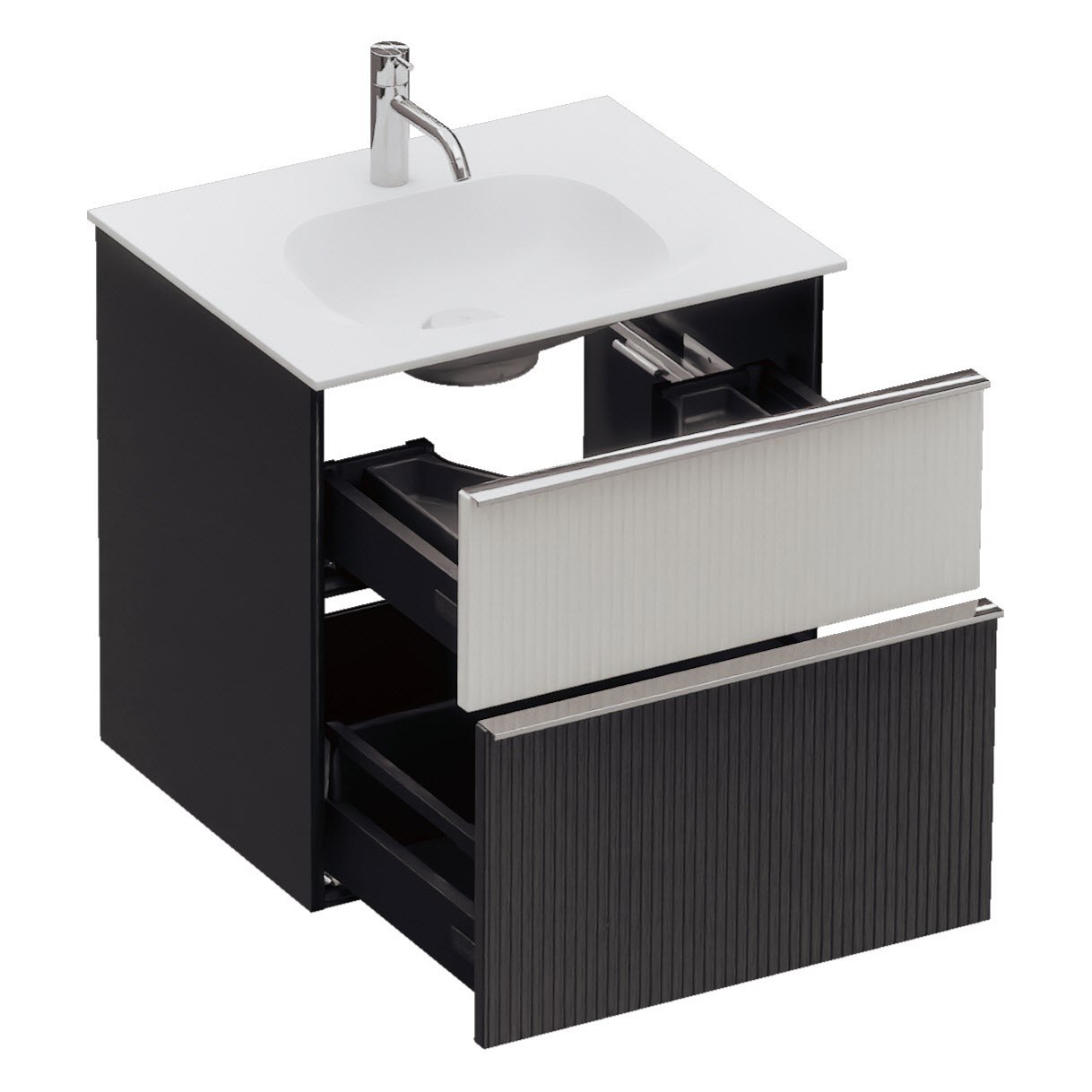 - 1 Schublade oben, 35 cm tief, mit vertikaler Struktur inkl. Siphonausschnitt und Inneneinteilung
