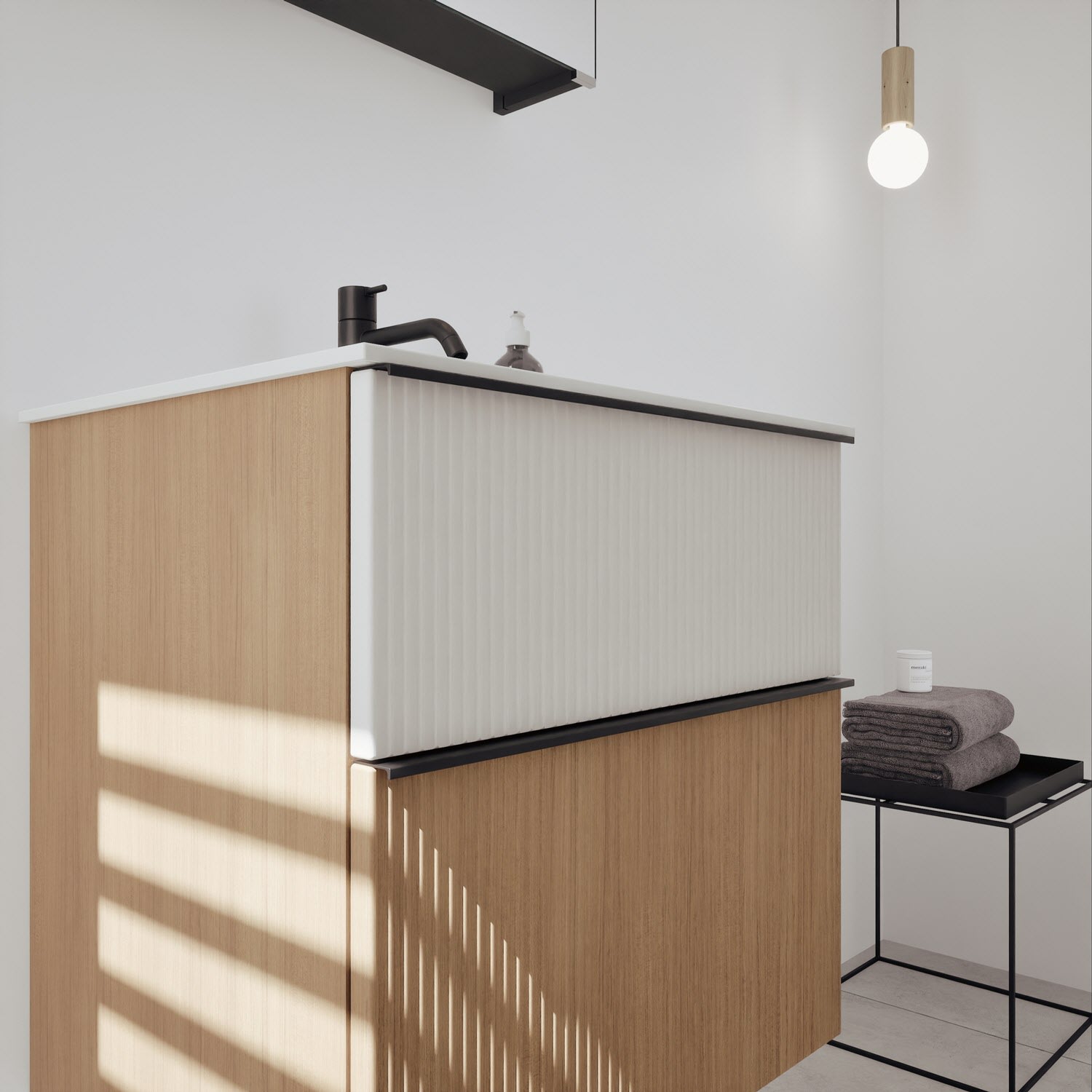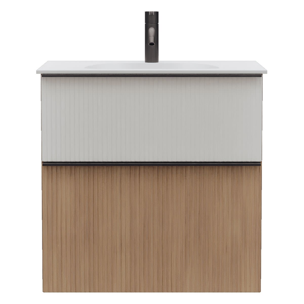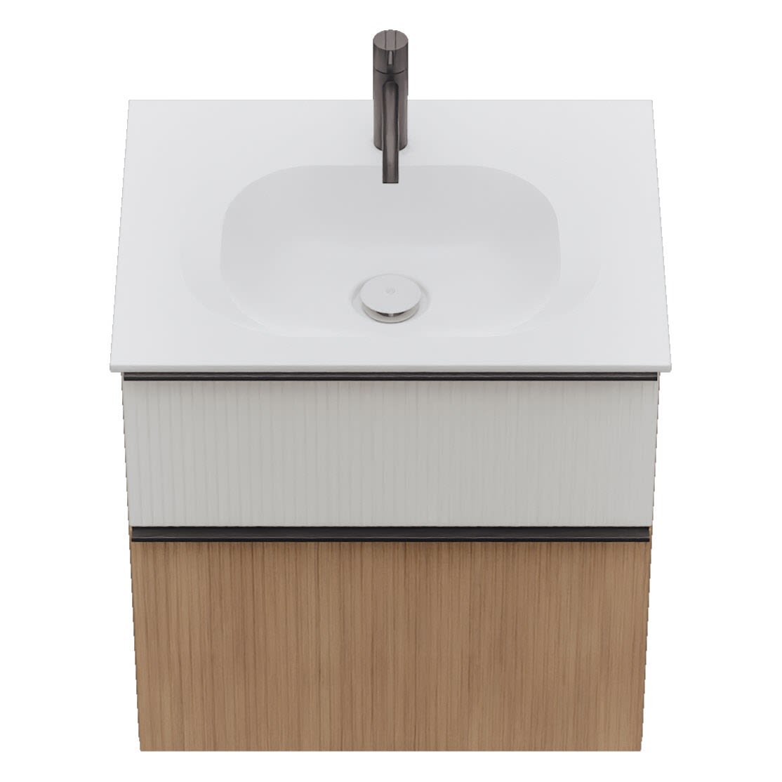 - 1 Schublade oben, 35 cm tief, mit vertikaler Struktur inkl. Siphonausschnitt und Inneneinteilung