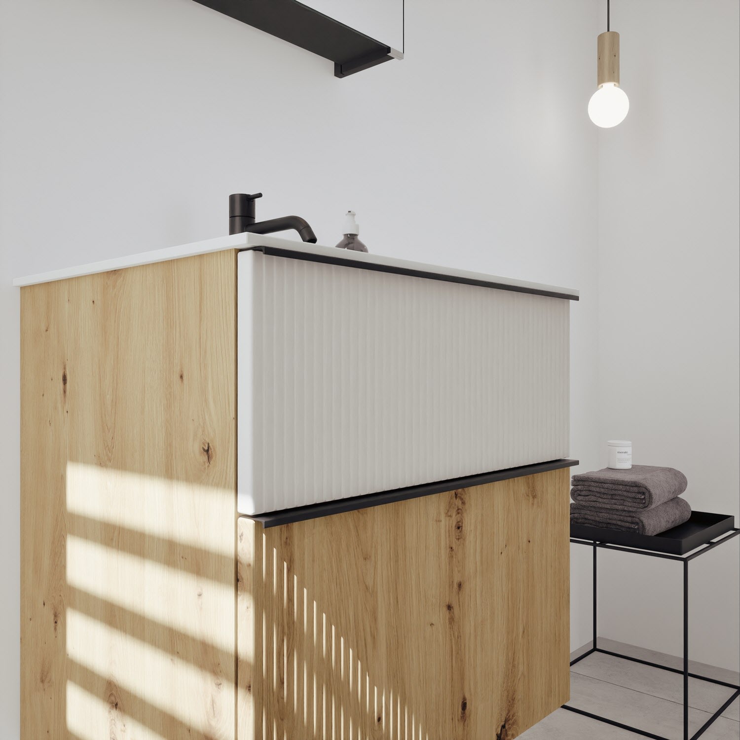 - 1 Schublade oben, 35 cm tief, mit vertikaler Struktur inkl. Siphonausschnitt und Inneneinteilung