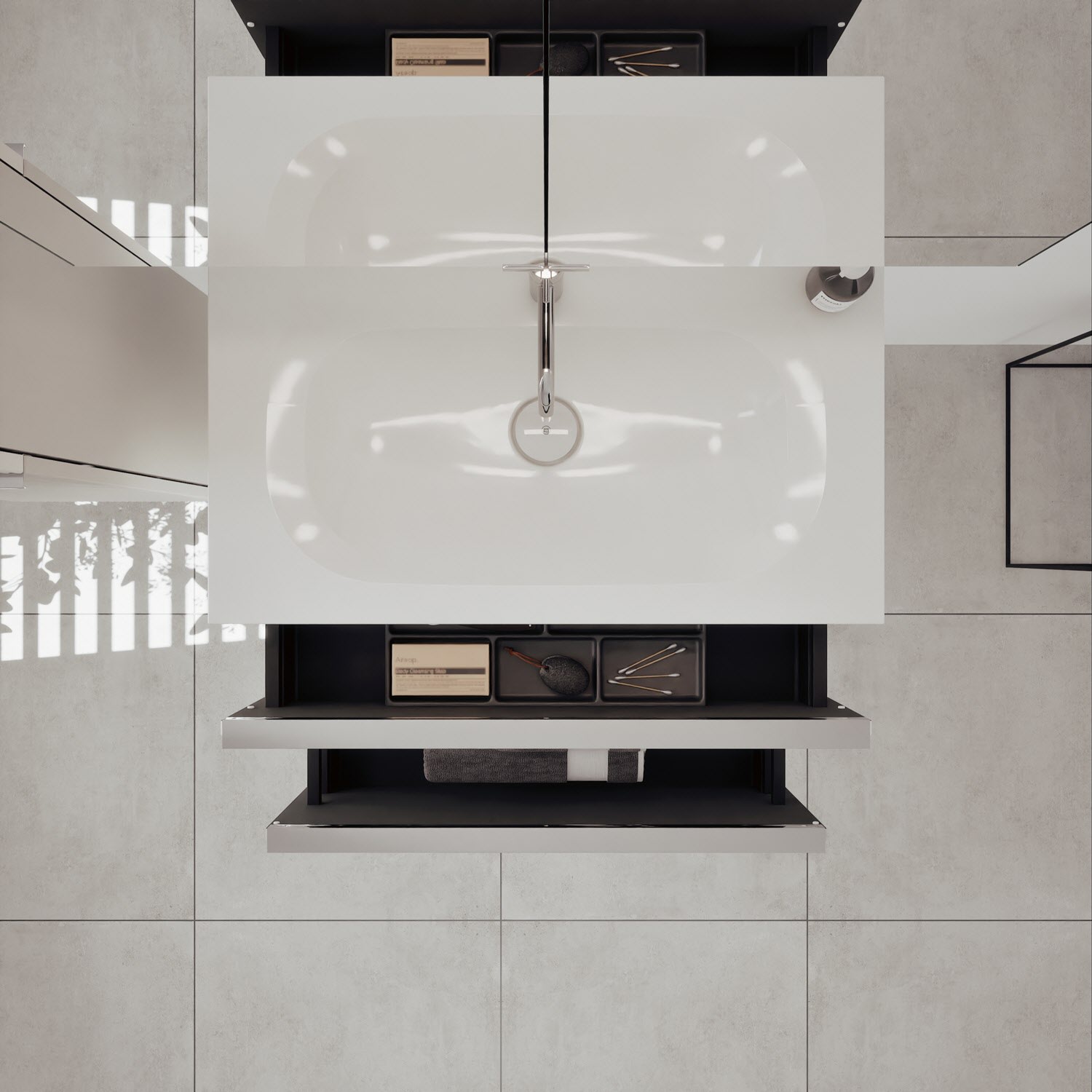 - 1 Schublade oben: 35 cm tief, mit vertikaler Struktur inkl. Siphonausschnitt und Inneneinteilung