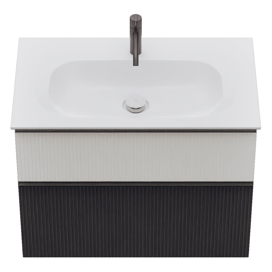 - 1 Schublade oben: 35 cm tief, mit vertikaler Struktur inkl. Siphonausschnitt und Inneneinteilung