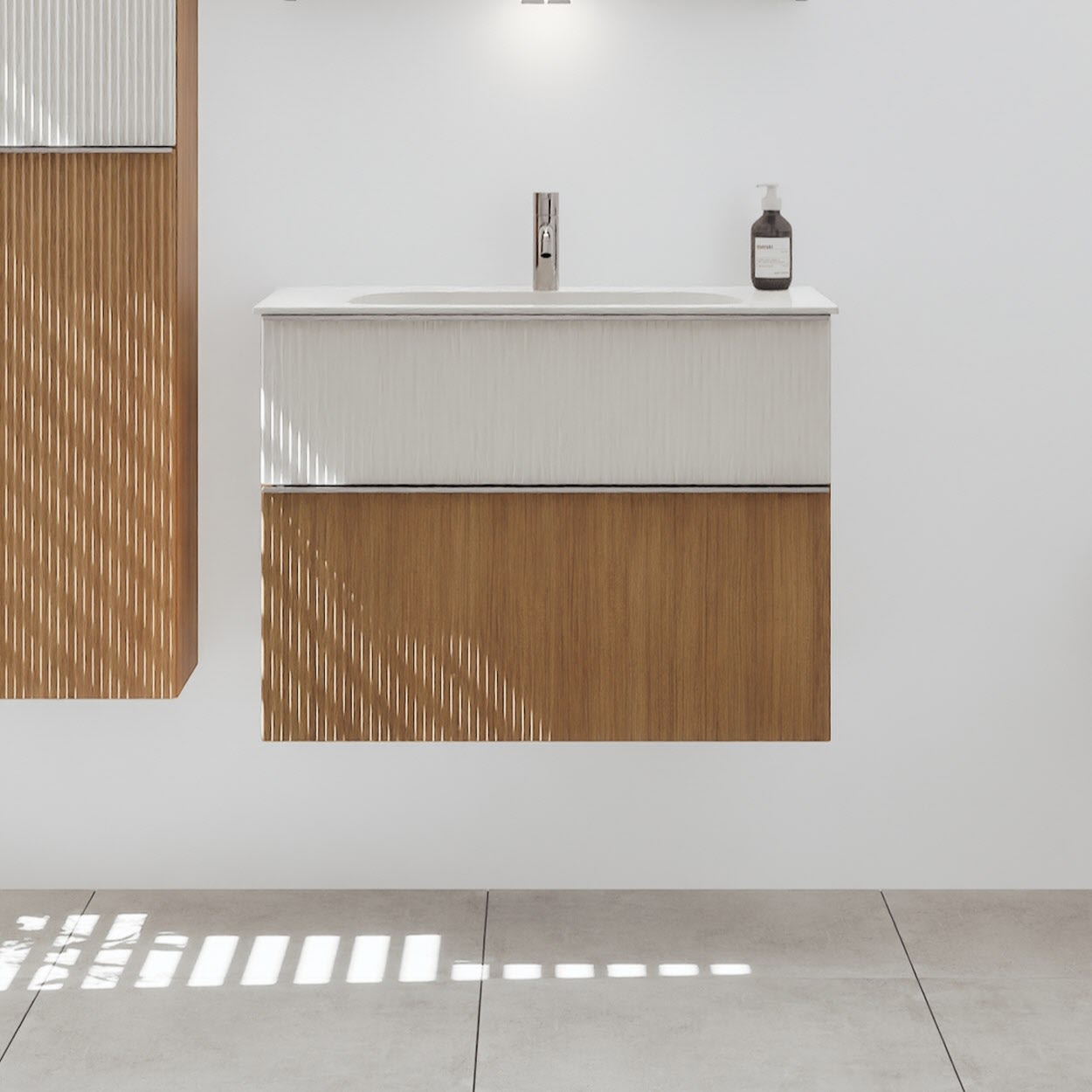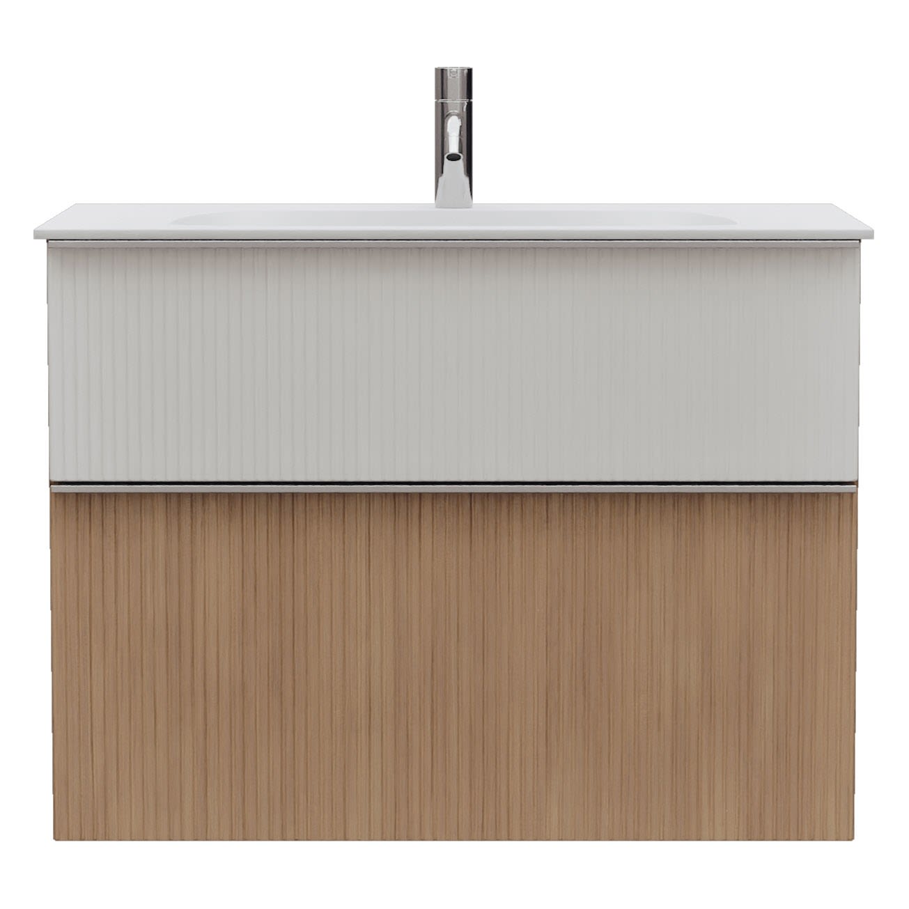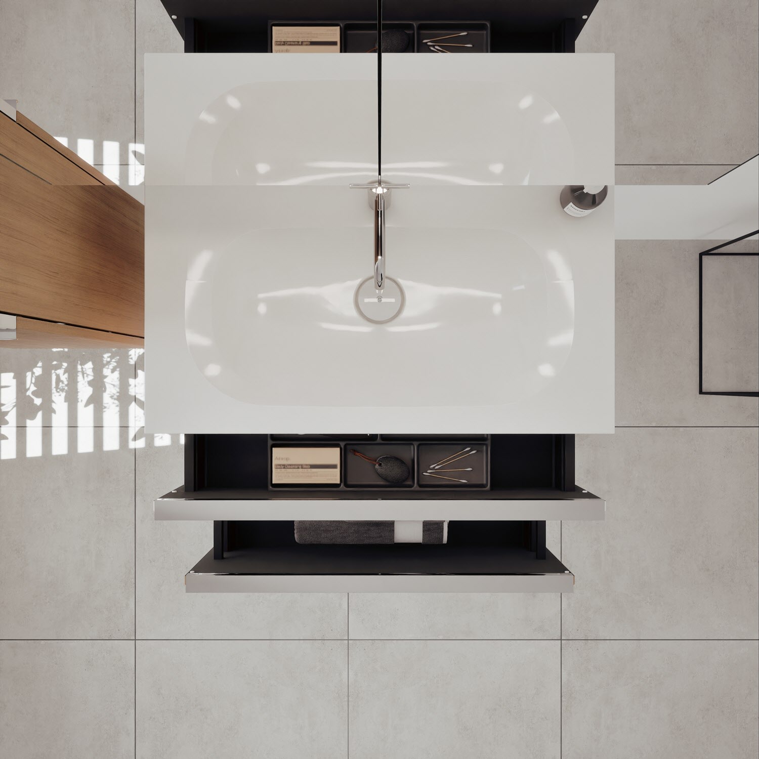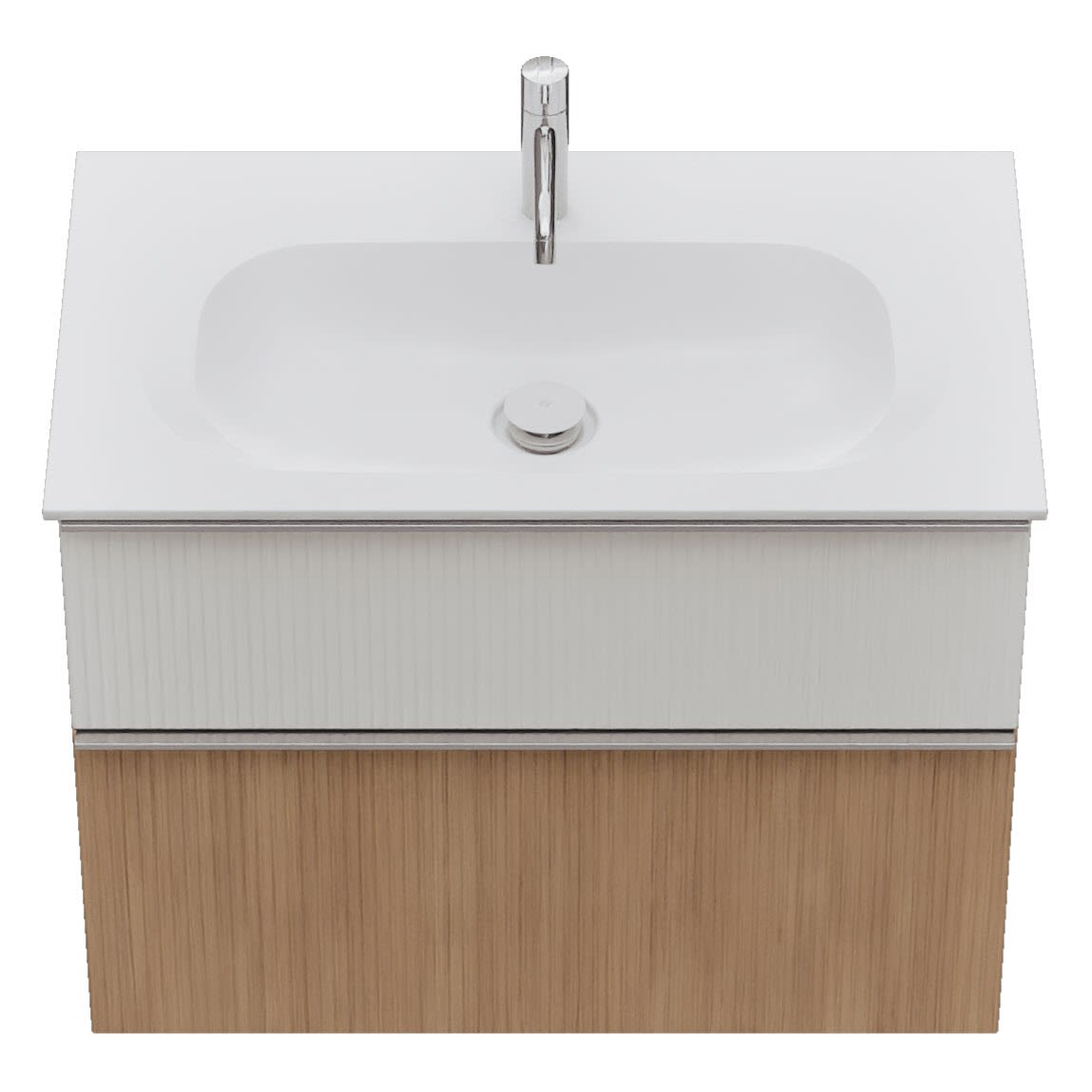 - 1 Schublade oben: 35 cm tief, mit vertikaler Struktur inkl. Siphonausschnitt und Inneneinteilung