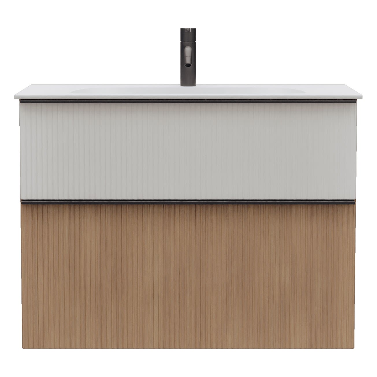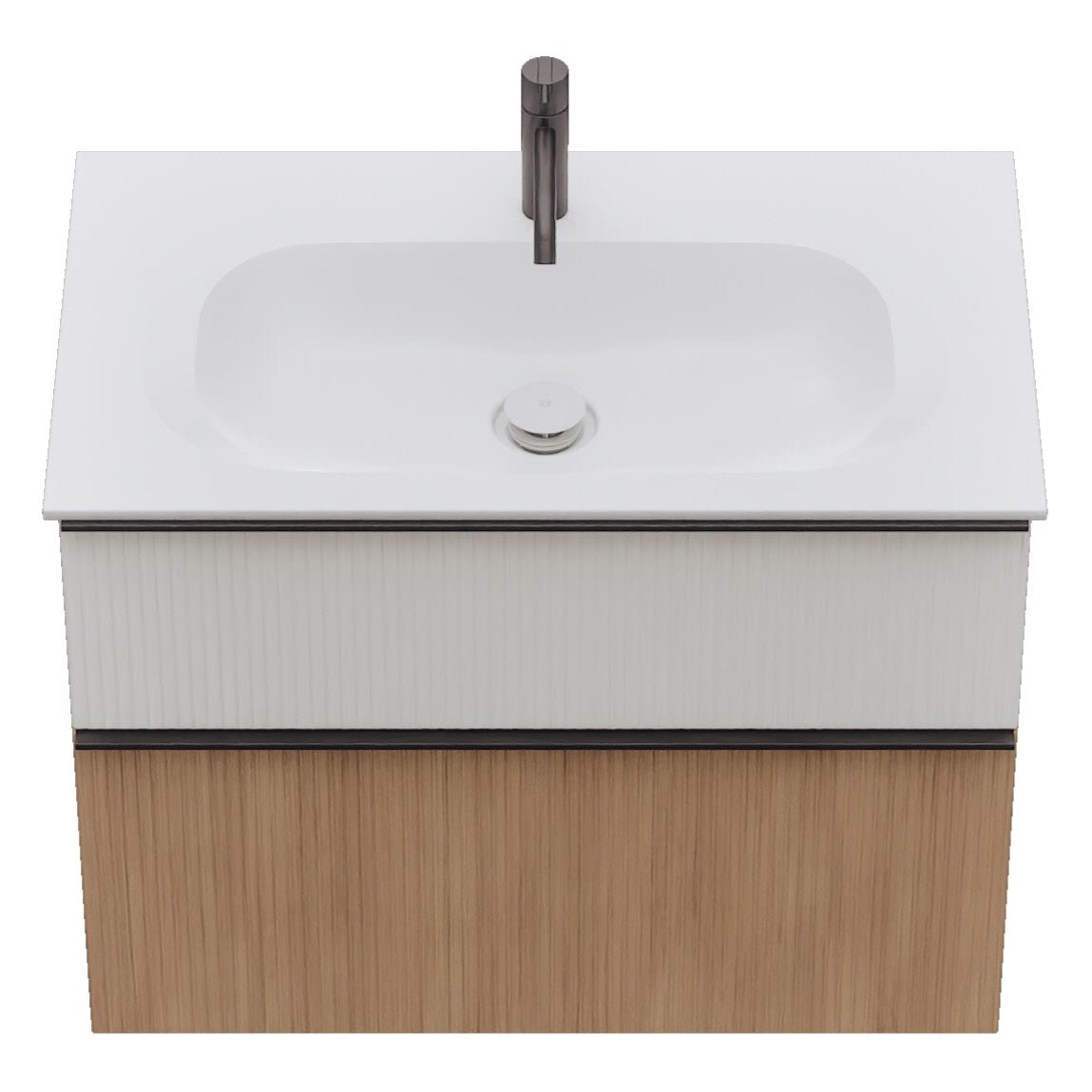 - 1 Schublade oben: 35 cm tief, mit vertikaler Struktur inkl. Siphonausschnitt und Inneneinteilung